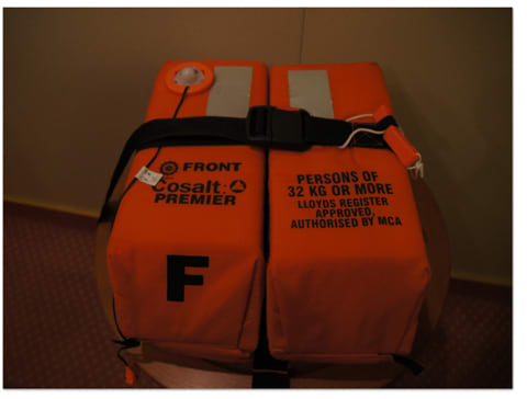 避難訓練には、各客室に設置されているライフジャケットを持って行きます