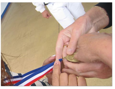 「ビギナーズ・ラックだねっ」なんて笑いながら、掛けてもらった金メダルに群がる人々(笑)