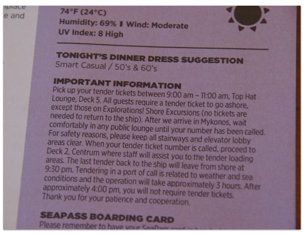 予定を確認すると、テンダーボートのチケットは、9:00より配布されるので