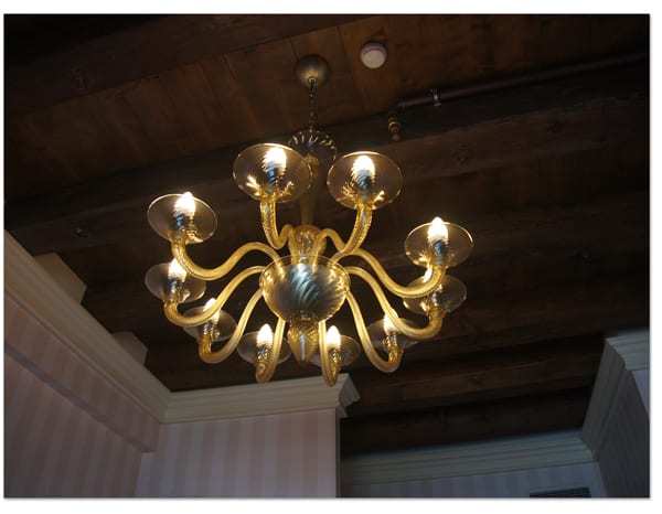 梁のある天井とシャンデリアが重厚な雰囲気を醸し出しています。