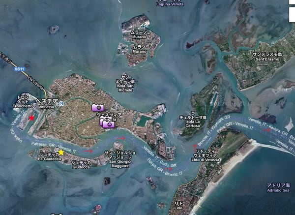 ヒルトンは黄色の★印のところに位置しており、クルーズ船の運行経路となっています。