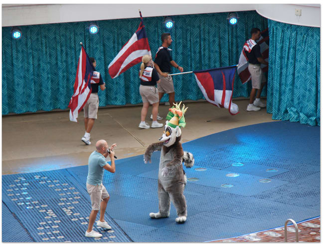 早々にキャビンへと戻り、バルコニーから出港イベントを見学して夕食へ。