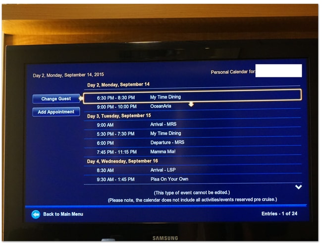 キャビン内のテレビで予定が分かるようになっていて、とても便利でした。