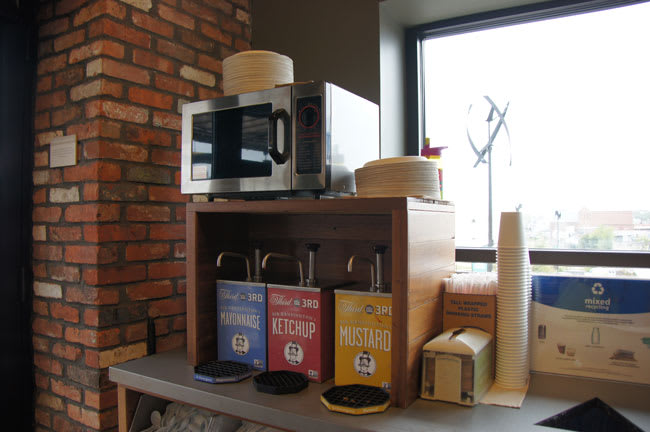 マヨネーズやケチャップにマスタード、レンジや紙皿やコップなども置いてあるため