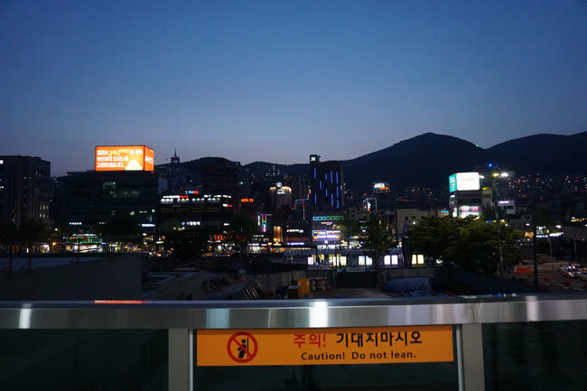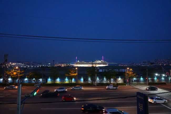 釜山駅の高架通路より、ライトアップされた船が綺麗に見えました。