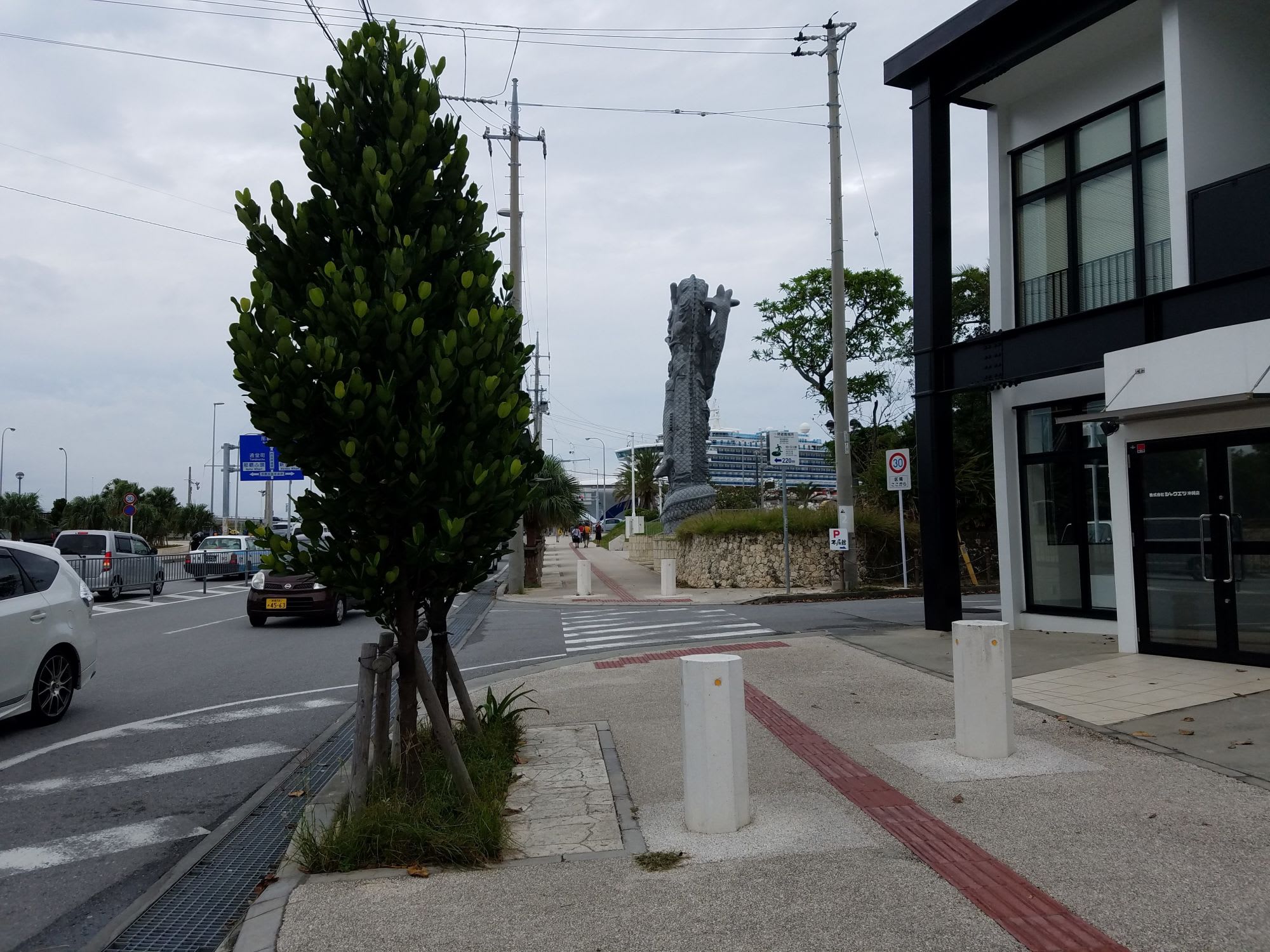 国際通りにつく前の、脇道で 坂になっているところにある竜の彫刻。