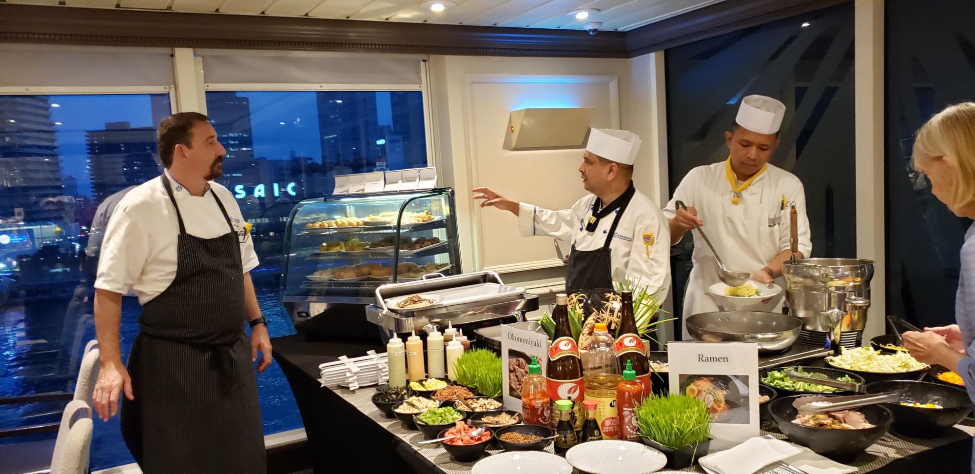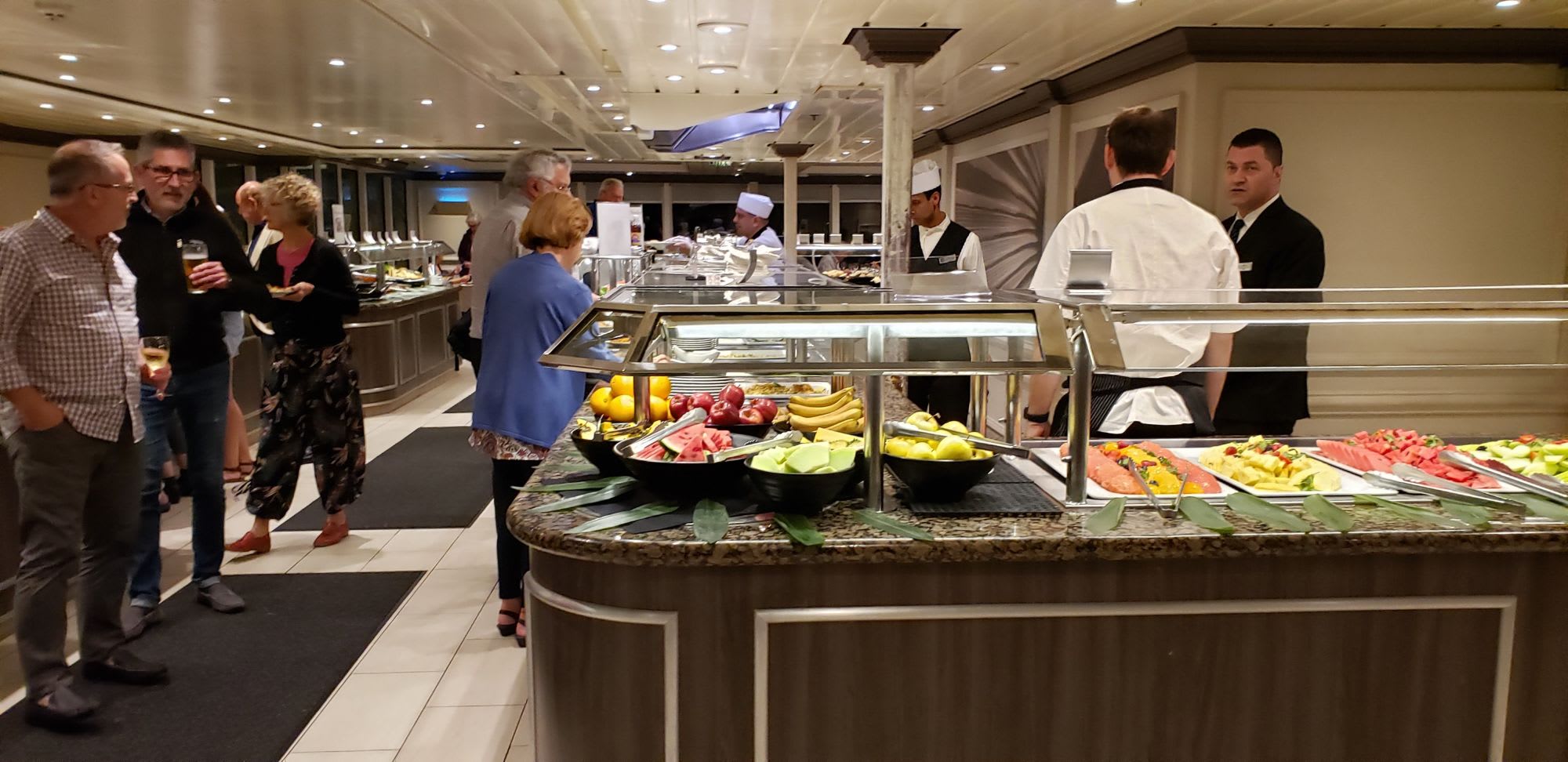 他のクルーズでも、レストランにはシェフが時々現れて挨拶したりすることはありますがこのように、グリルやバフェでチェックする姿は珍しいと思います。