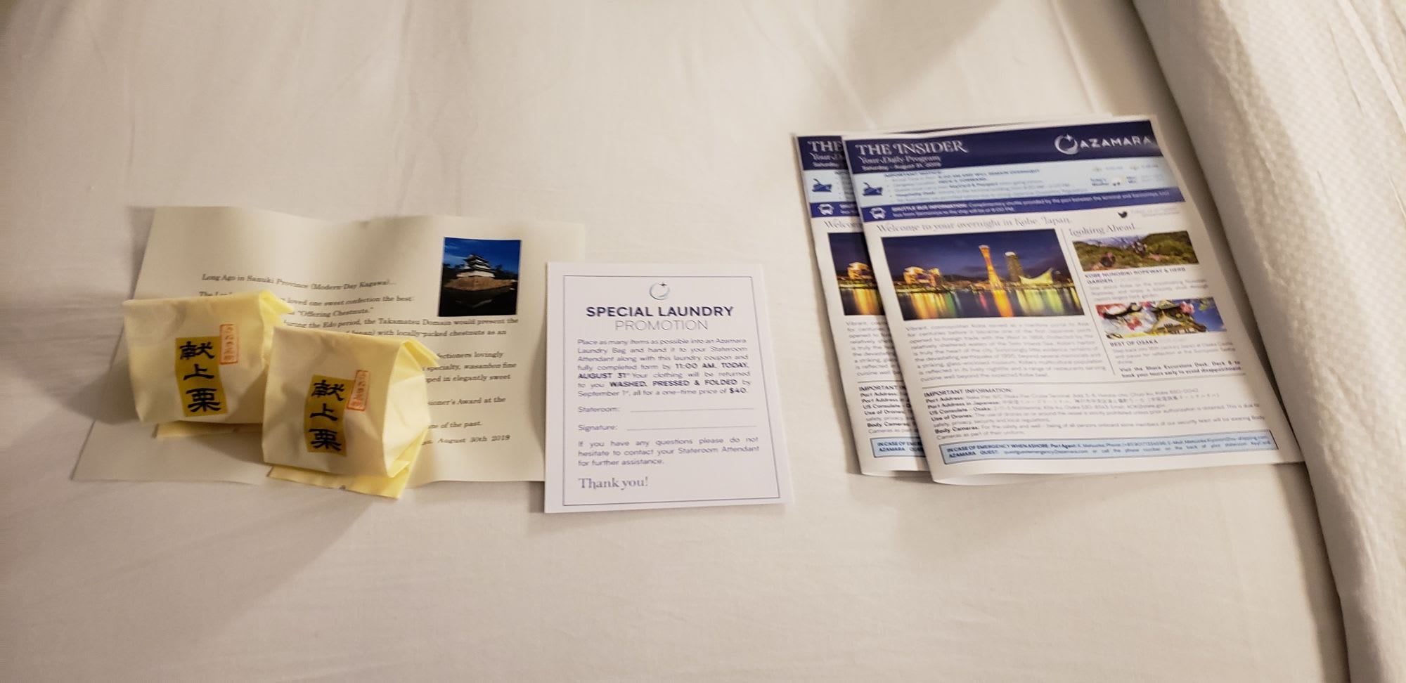 寝る前に部屋に帰れば、毎日日替わりでミニケーキやトリュフチョコレート、時には寄港地の有名和菓子が届いたこともありました。