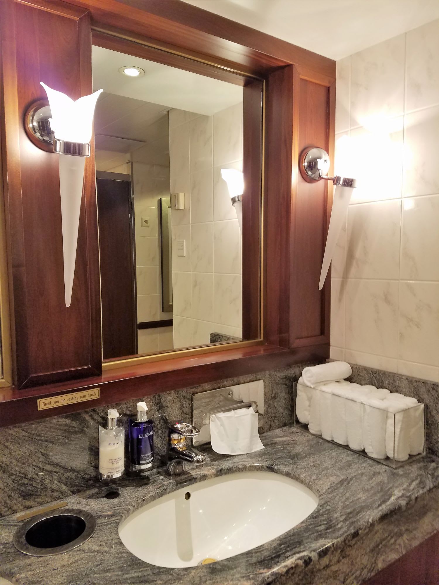 生のお花が飾られていることがあって、それも化粧室のなかまでも、生花がいけられていましたし、なんと手洗いの後のためのタオルがたくさん置いてあったことです。