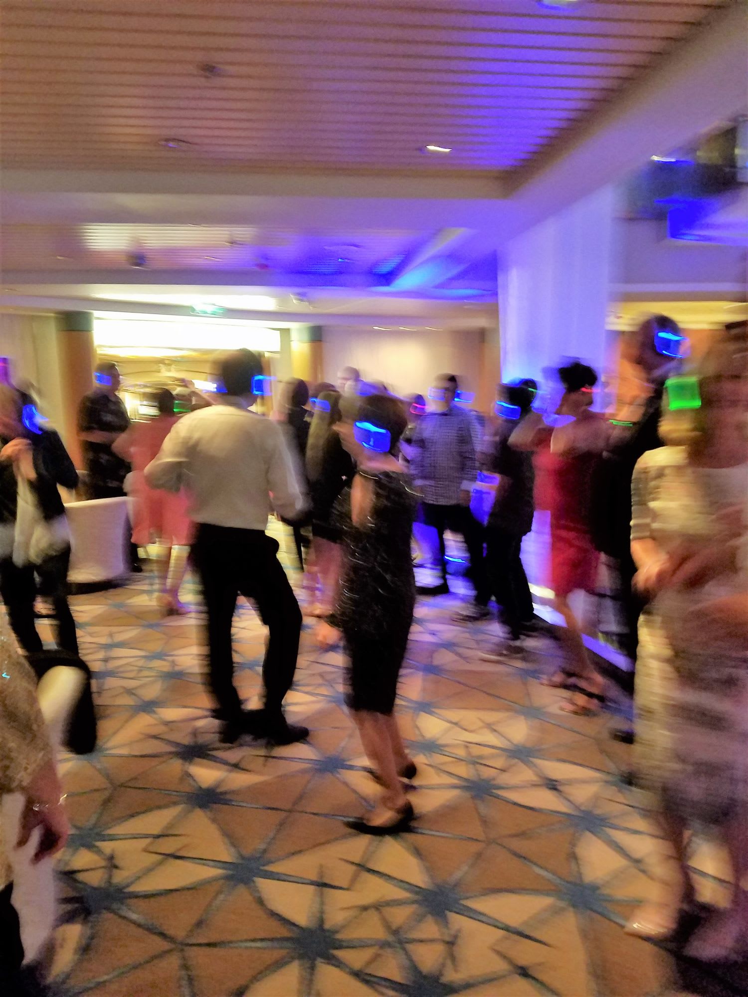 ヘッドフォンにDJが 飛ばす3種類のディスコミュージックを きいて踊るのですが カップルでも それぞれの好みの音楽を聴くことも 一緒のものを 聞くこともできて、ヘッドフォンですから 音がしないまま みんな踊ってるのです。