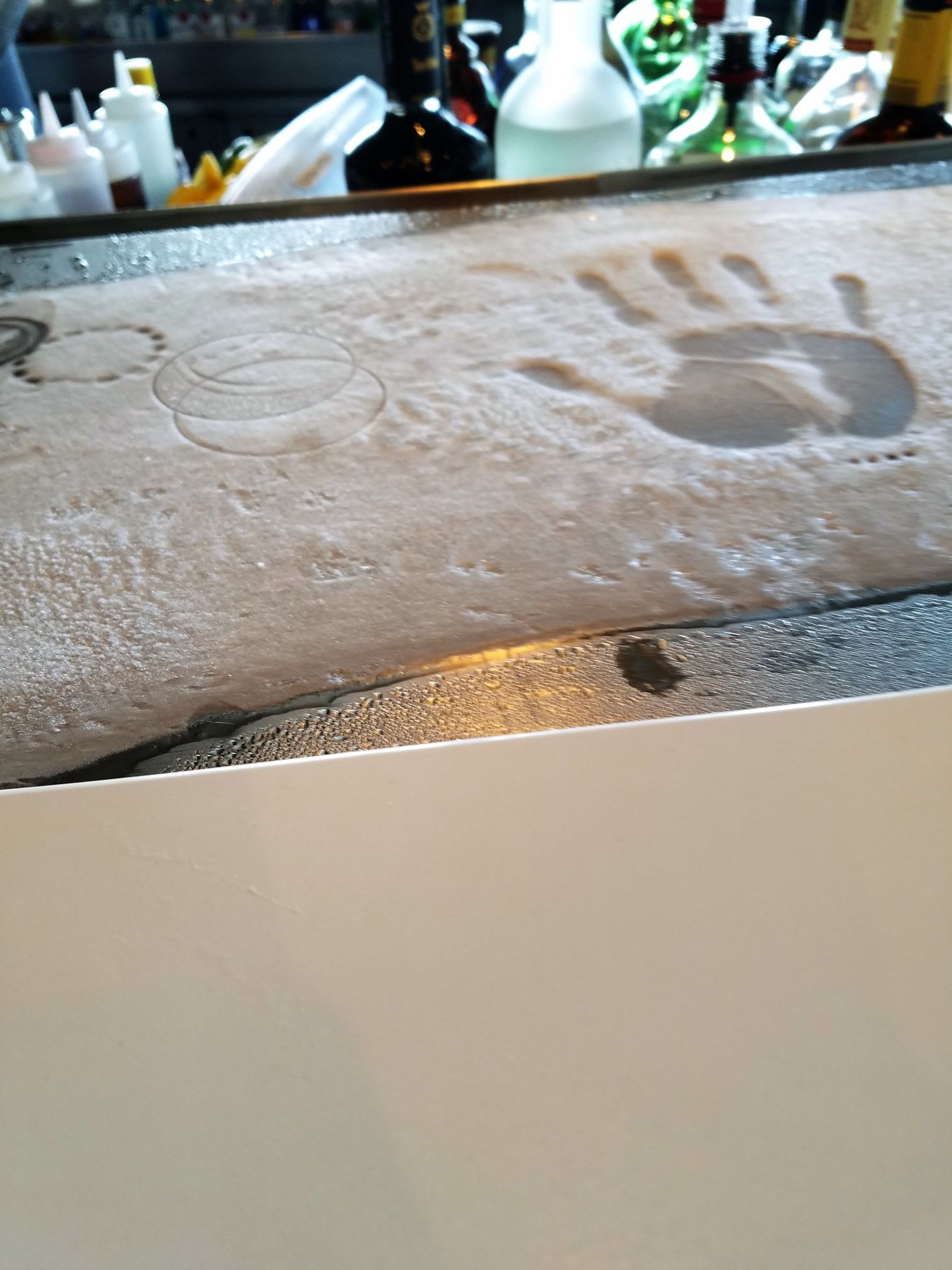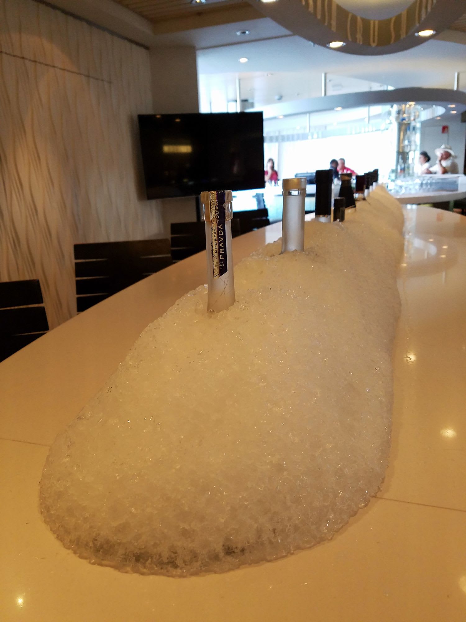 カウンターの周りが アイスクラッシュなんです。雪のような氷の中に お酒の瓶が埋まっていて、カウンターも冷たくて お酒の味が 変わらないようになっています。