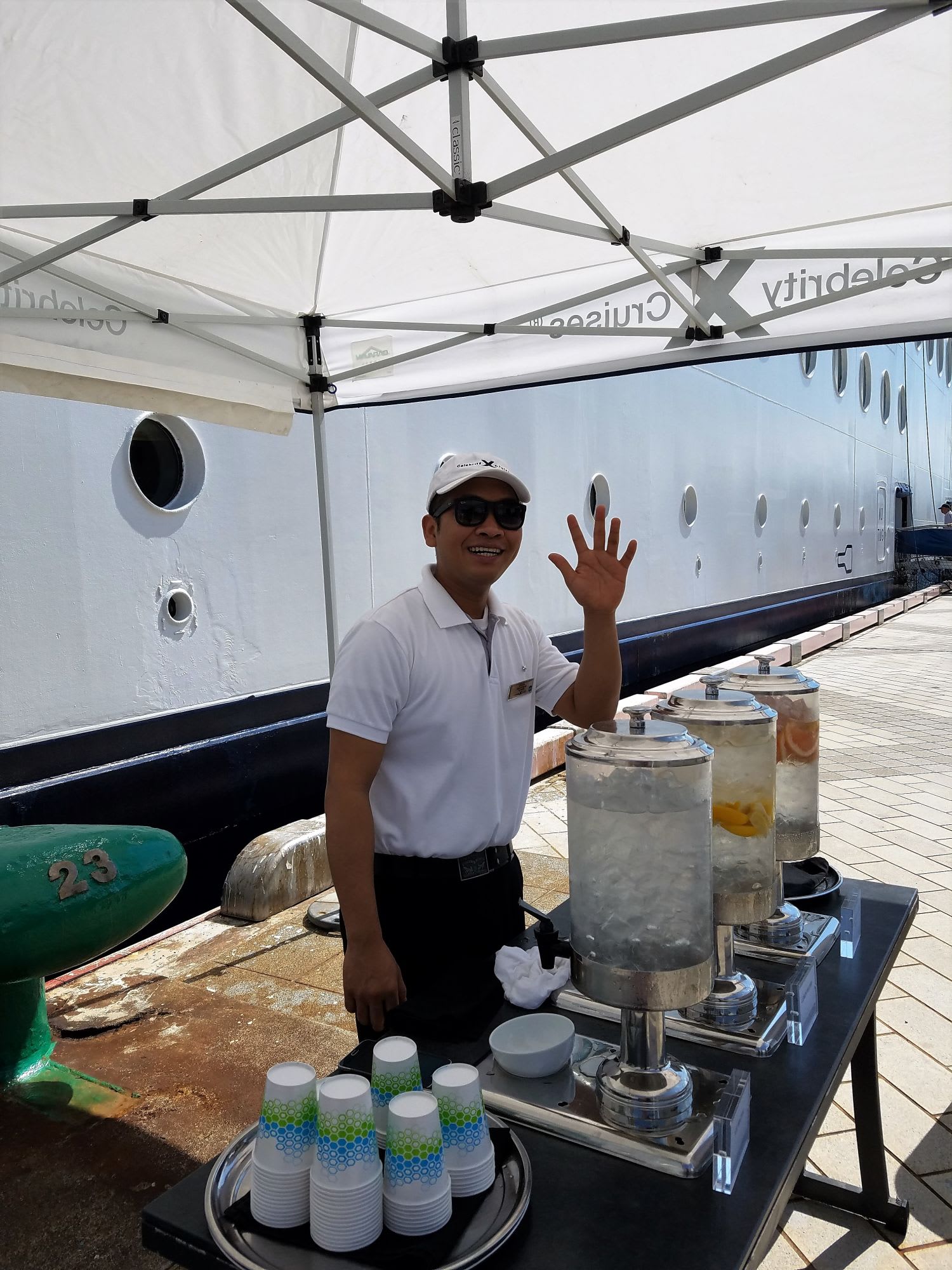 そして 暑い中 自分で 歩きまわって 帰ってくると 船の 乗船口の外で 冷たいお水と凍ったおしぼりのサービスが待っています。