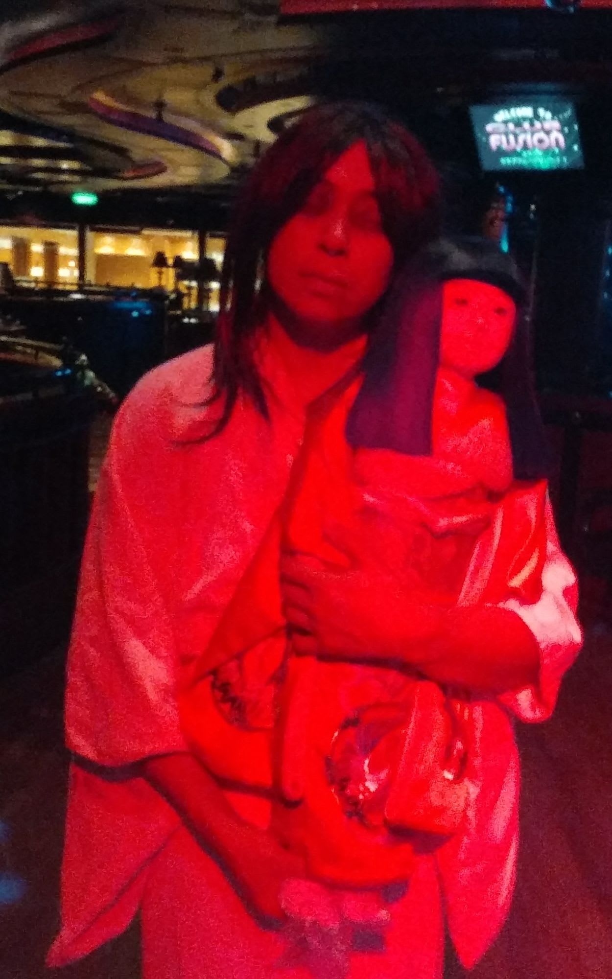 取り立てて、お化けの仮装は持っておりませんでしたが、あるものでお化け化してディナーの席にも行きました。