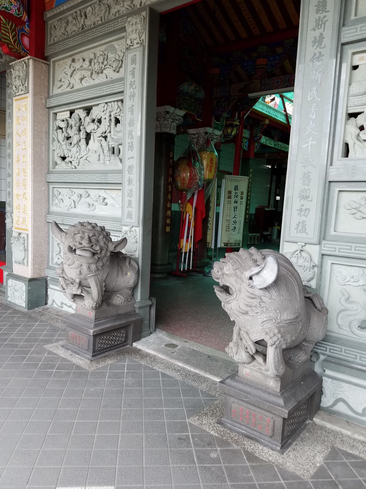 商店街の中の寺院の入り口の番人はちょっと かわいらしい。
