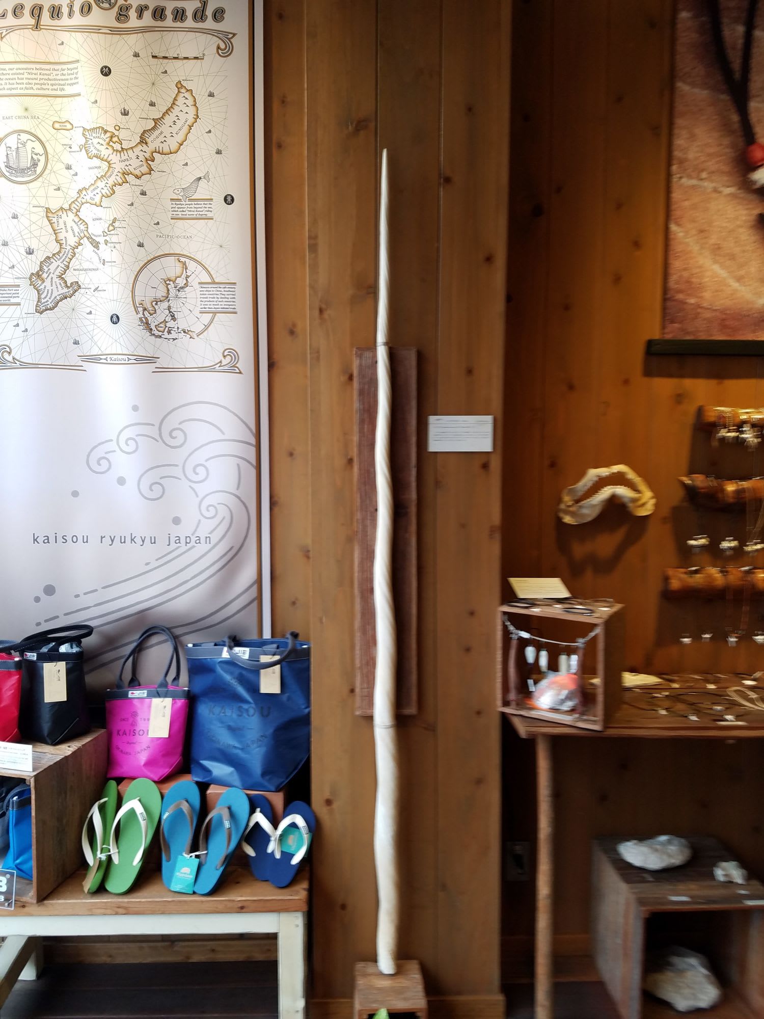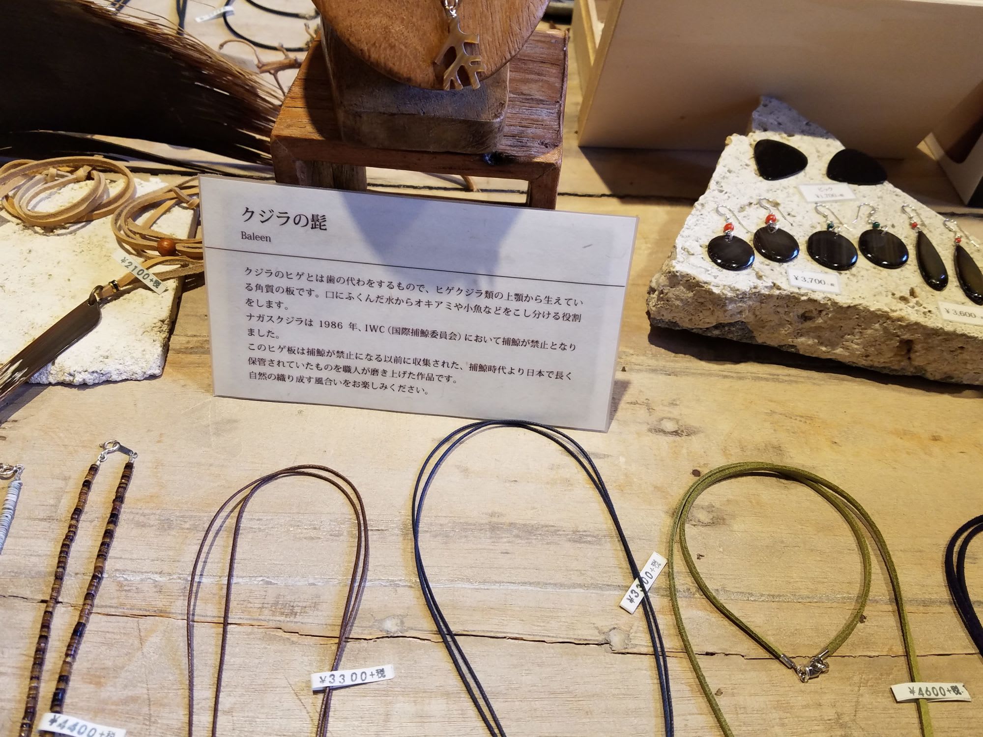 クジラのひげで作ったアクセサリーや オリジナルなtシャツやかりゆし、ショートパンツなどもあり、アクセサリーもオリジナルのものがあって、イヤリングをピアスに変えるとかぎゃくとか、ネックレスなども 希望におうじて、ささっと直してくれます。