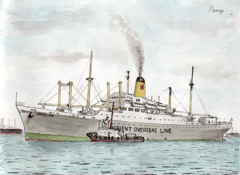 いかにも昭和のころの改造型貨客船の雰囲気を持っていて、造形的にもわたし好みの船です。姉妹船のオリエンタル・パールとともに日本にも定期的に来航していましたが、1974年には解体されてしまいました。