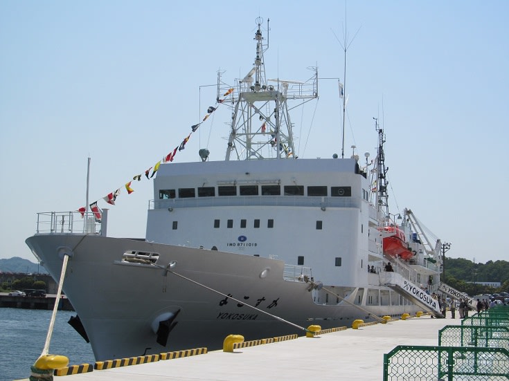 まずは深海潜水調査船支援母船というやたら長ったらしい肩書のつく「よこすか」(4439トン、1990年建造)。