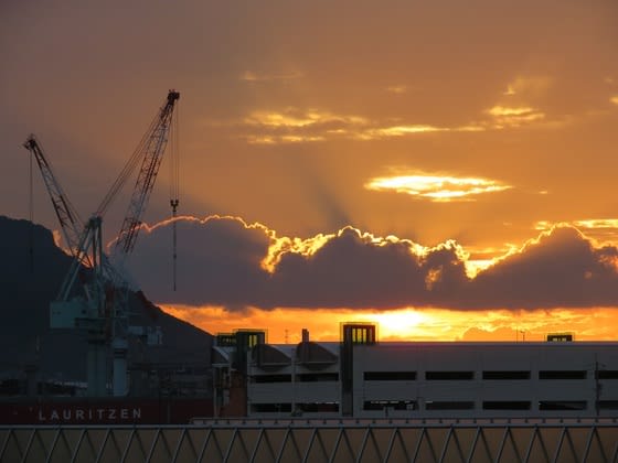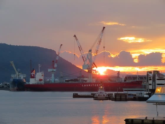 四国ドックで建造中のバルクキャリアの向こうから昇る朝日