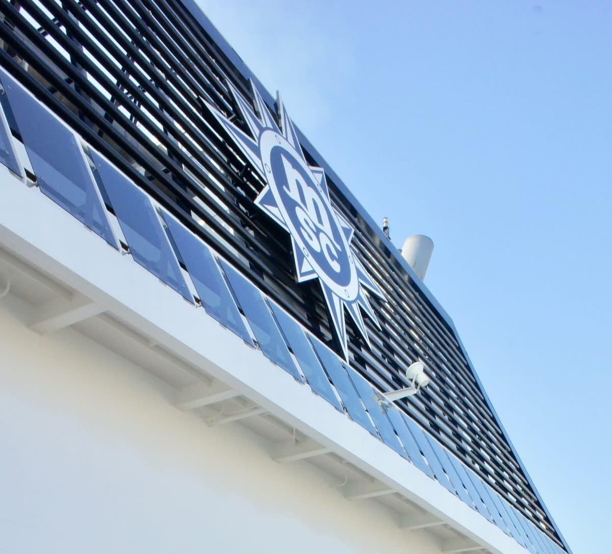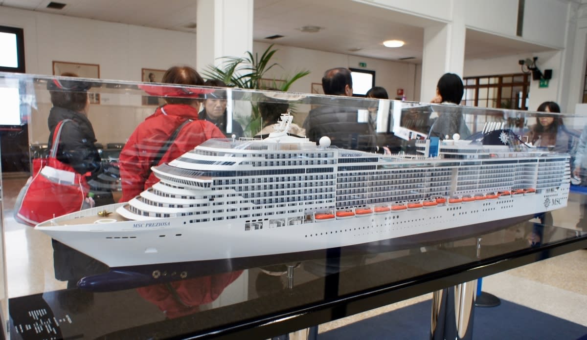ジェノバで一泊して次の日の朝、近くのショッピングモールに行くと、乗船するMSCメラビリアが見えてきました。