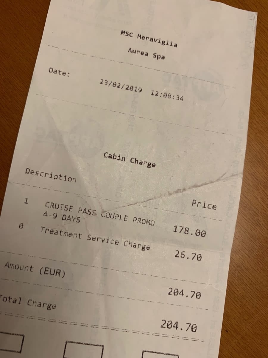 レシートは二人分です。鉄の大きな二枚扉を開けると大きな長い通路、その奥がサーマルエリアの受付で、期待感が高鳴ります。ミストのかかる道、ジャグジー2つ。じんわり温かい岩盤リクライニングチェア。スチームサウナ4つ。氷の部屋。リラックスルーム2つありました。あまりMSCホームページにも写真は乗っていませんがMSCのスパは、上質でした。リラックスルームにはヨーロッパの方々が何人も、くつろいでおられました。女性一人で入っても大丈夫なような安心感もありました。