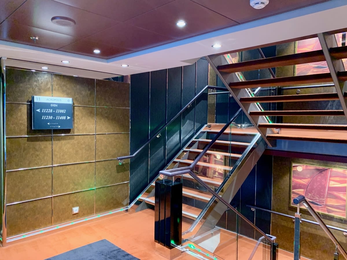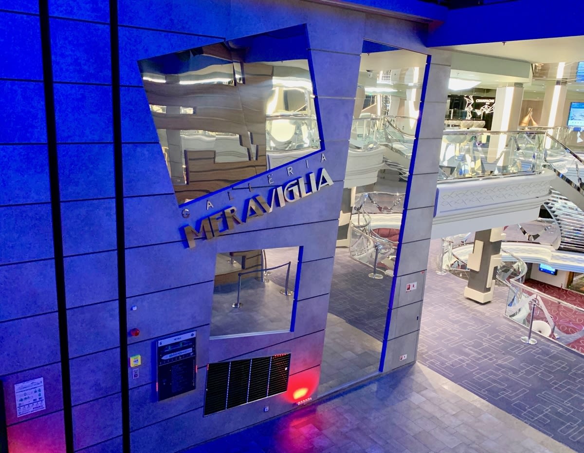 大好きな天井LEDつきプロムナードの入り口です。MSCメラビリアは4000人乗客定員の大型客船なので、飛鳥に比べて揺れがあまりなく、走行していることに気づかないこともよくありました。
