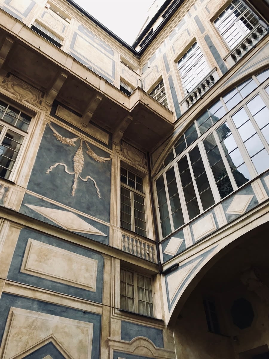 中庭に入ると、三階まであるバルコニーがあり、ゴージャスでした。ジェノバ共和国時代の繁栄を物語るようで、感動しました。