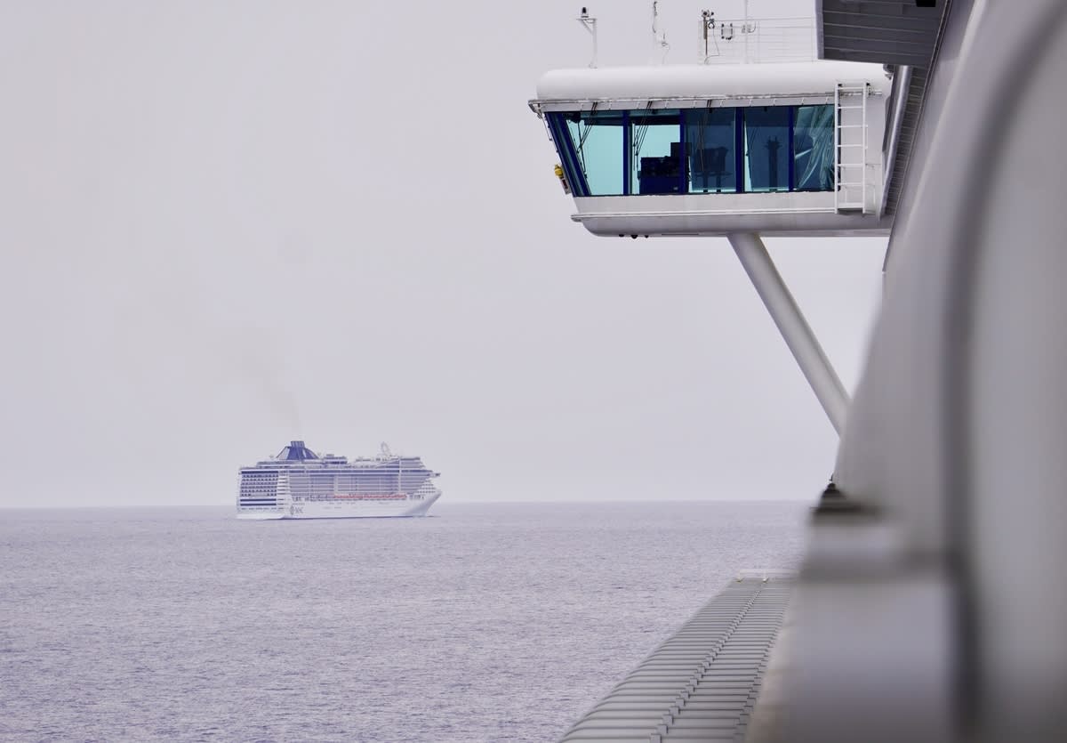 ふとバルコニーに出ると、遠くにしばらく私たちのお船を追いかけるように、ついてきたMSCスプレンディダを見つけました。