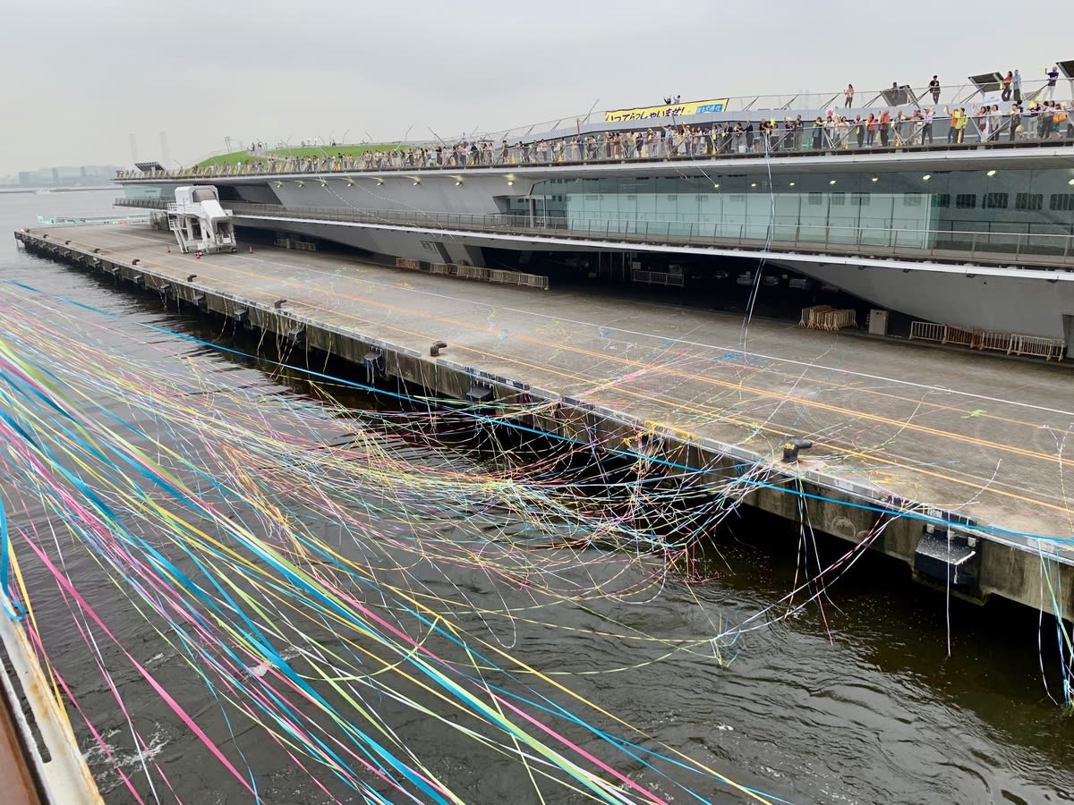 いつものように出航はテープが配られます。お船が港から離れると、テープが引っ張られて、ますます綺麗になりました。