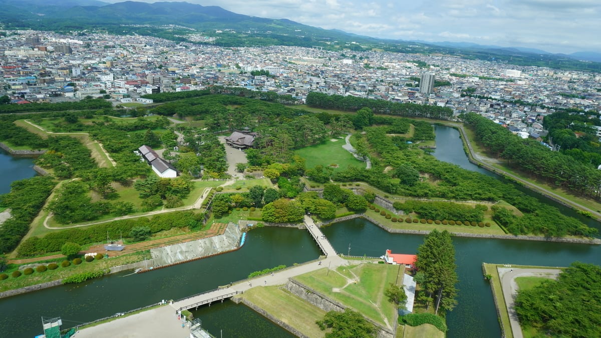 奥の方には、緑茂った五稜郭があり、日本らしい落ち着きも感じます。