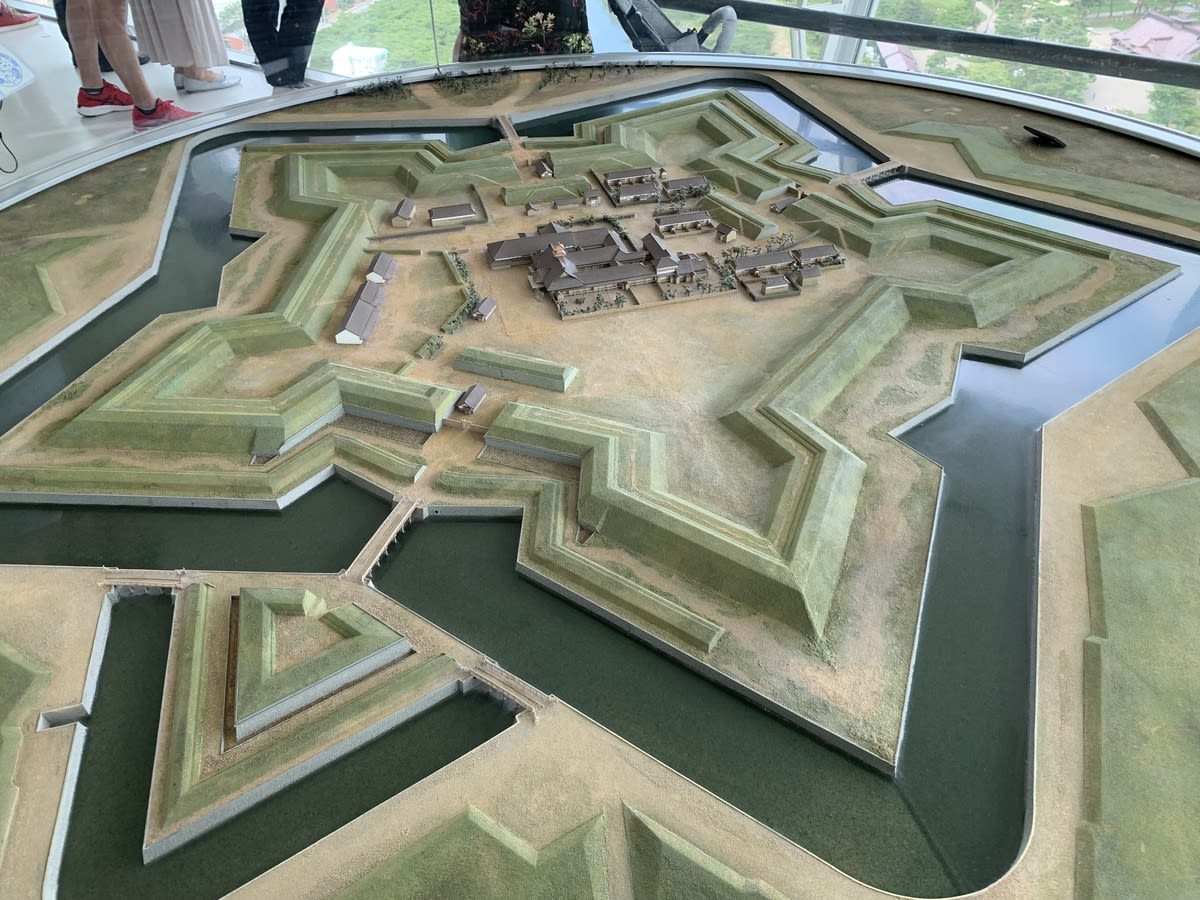 五稜郭タワーに登り、五稜郭の全貌と中心にある奉行所への行き方を確認しました。