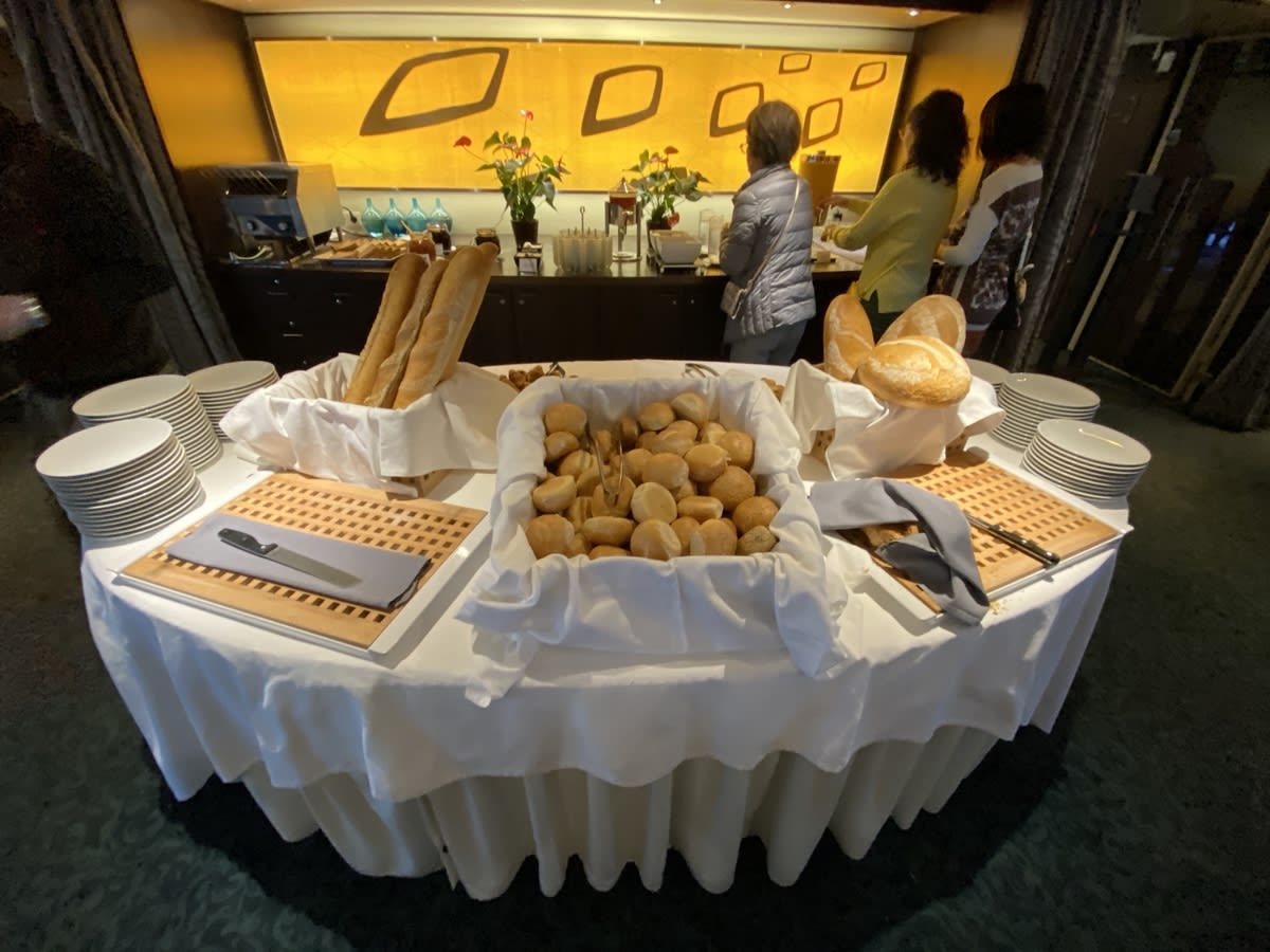 朝は、バイキング形式で、専門のパン職人のクルーが作ったパンは、美味しかったです。中華風のお粥があり、生姜とお醤油をかけて毎日いただきました。