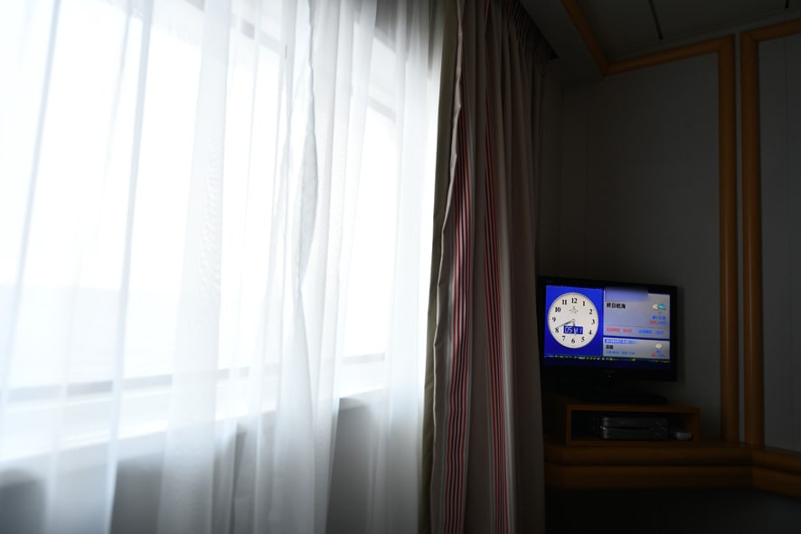日の出が早いのは分かっているがこの時間から起きるつもりのない僕はカーテンを閉めるのの煩わしさから明かりを避けるように体を船内側に向けて二度寝の体勢。