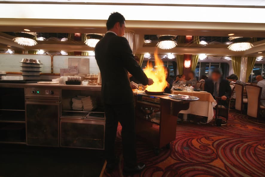 クレープにアルコールの高い炎にオレンジの香りを付けたソース。