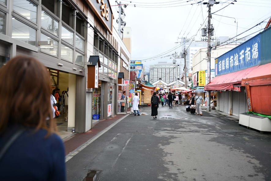 「朝市」とは言っても「朝」ではなくなった商店街は早終いを始めた店もあり観光客の人出と比例した活気。