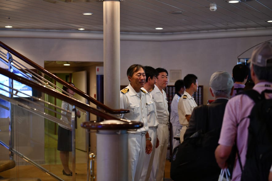 キャプテンをはじめ白い制服の航海士たちは一人一人の乗客に感謝を述べたり握手をしたり、写真撮影に応えたりしている。