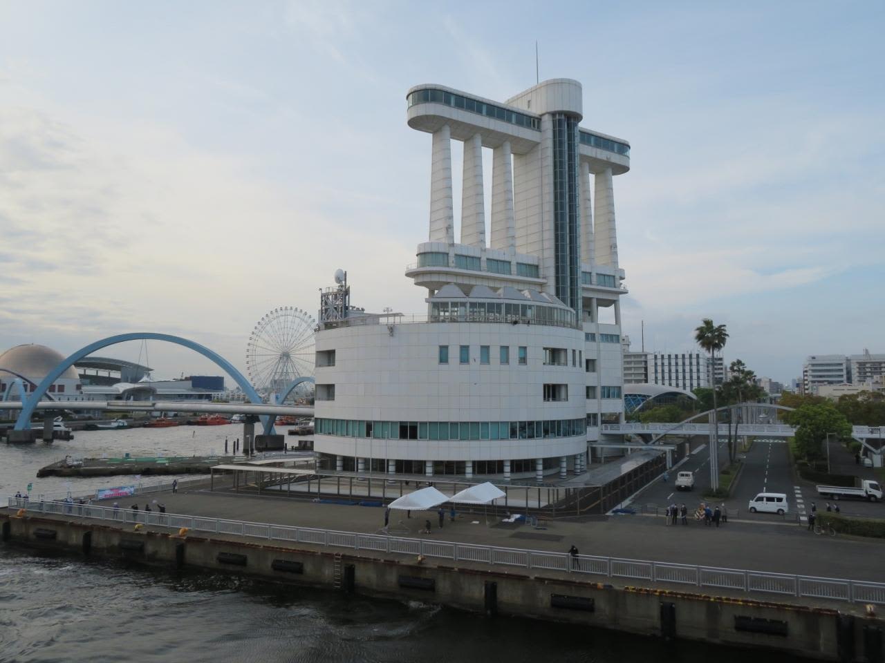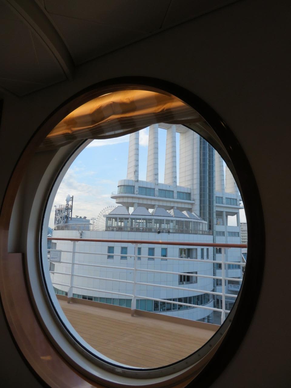 にっぽん丸シンボルの大きな丸窓から見る名古屋港ポートビル