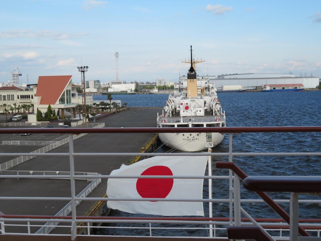 にっぽん丸の船尾に映える日章旗と青雲丸。
