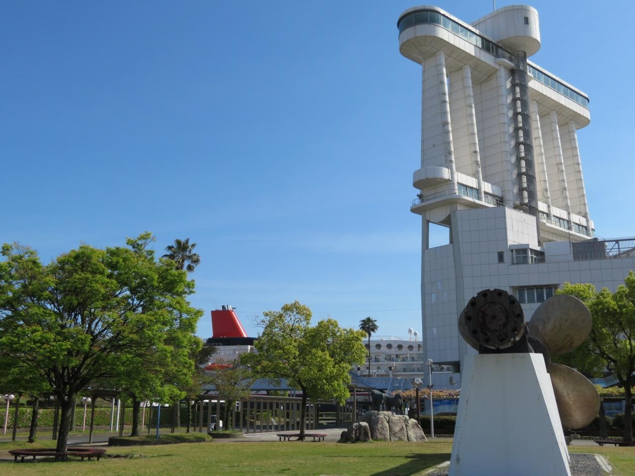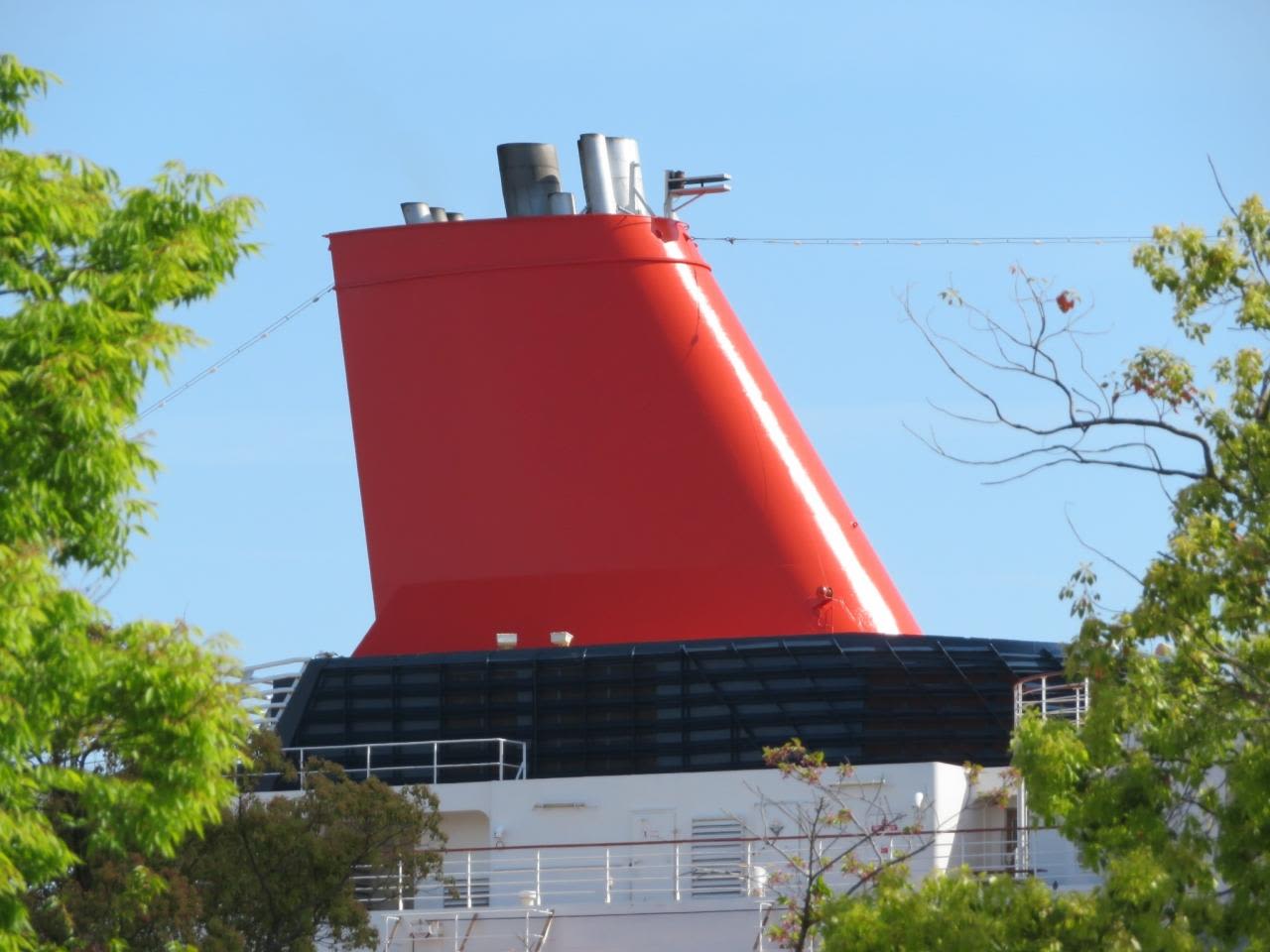 ガーデンふ頭には にっぽん丸が停泊しており、久しぶりにオレンジ色のファンネルが新緑に映えています。