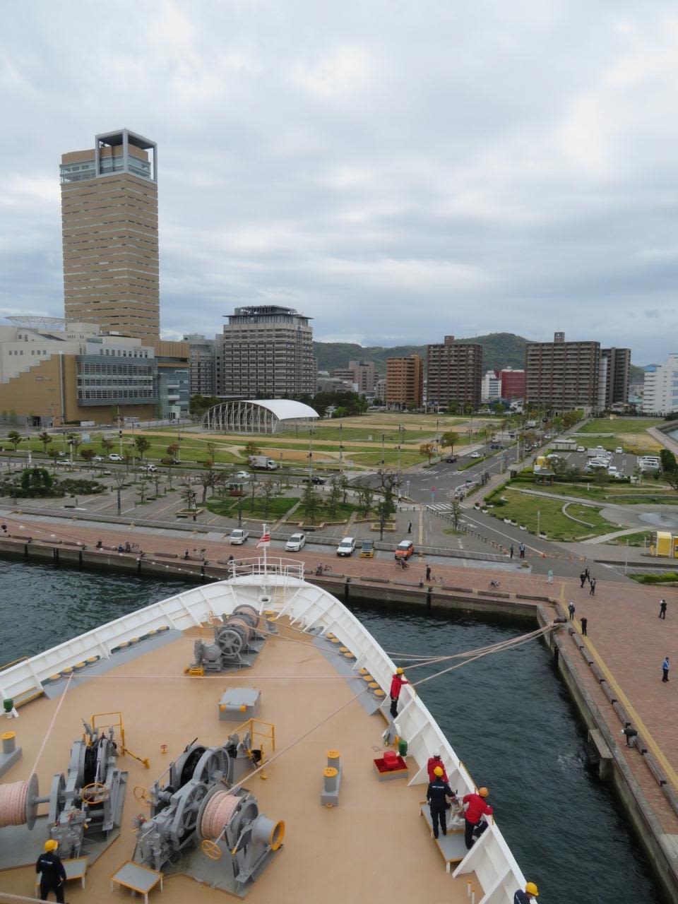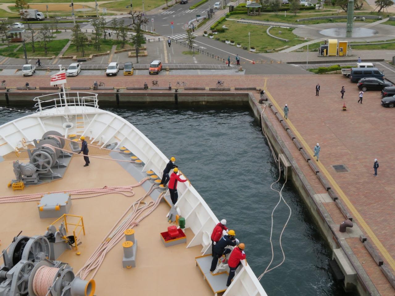 にっぽん丸は2年前にグアムで接触事故を起こしたことがあるので、慎重な着岸準備態勢を取っており緊張感が漂ってきます。