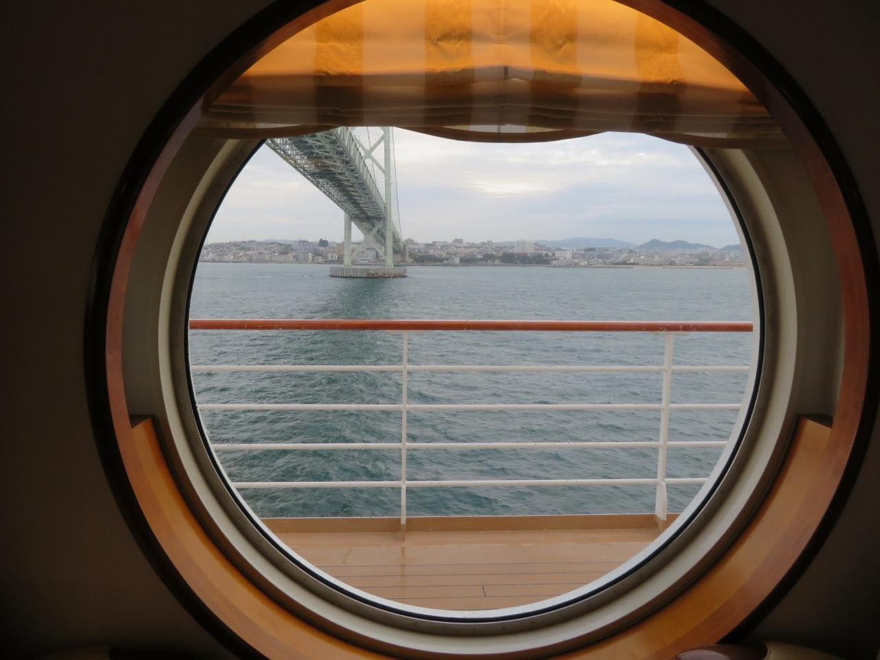 丸窓から通過する明石海峡大橋を眺める