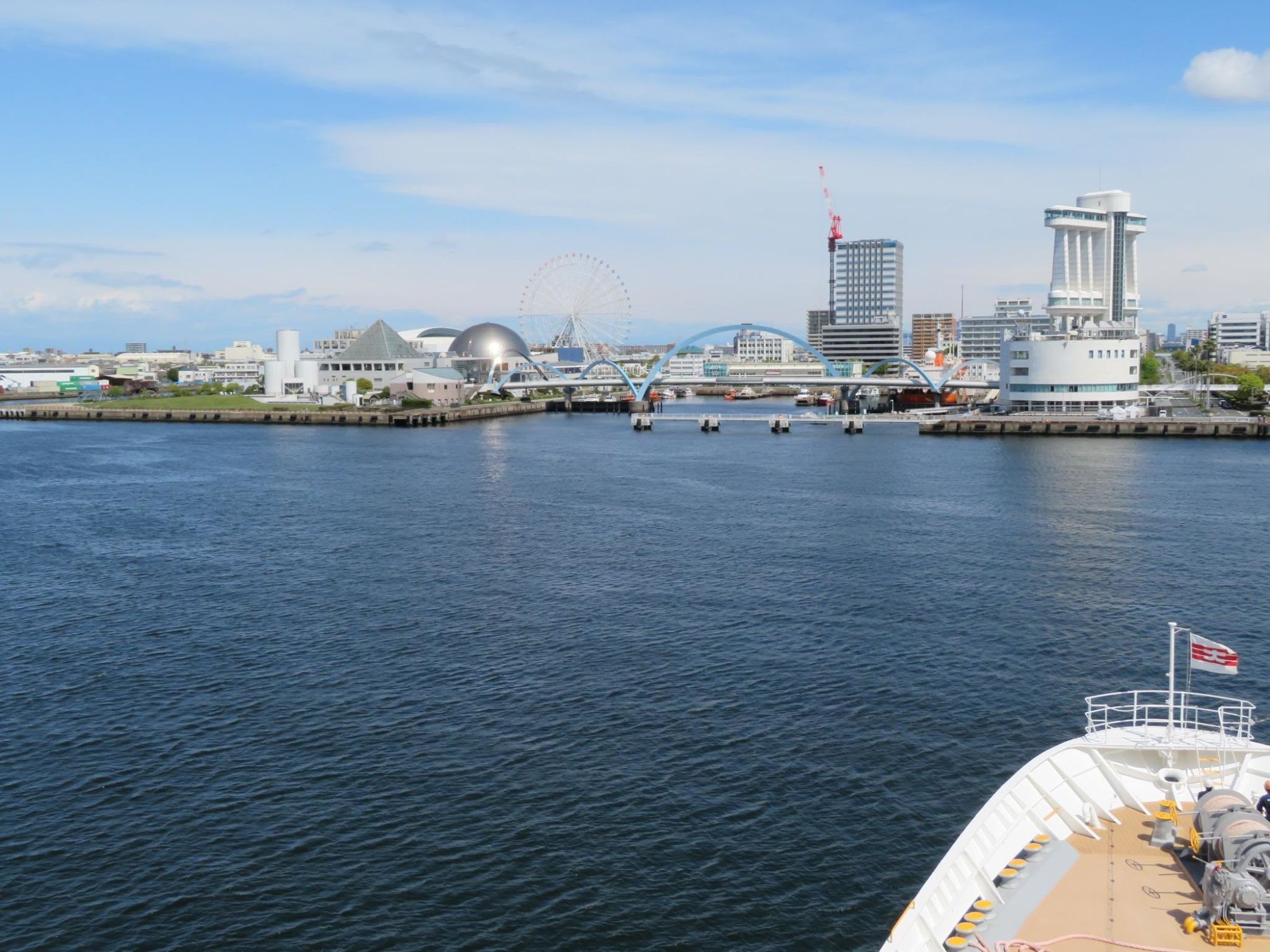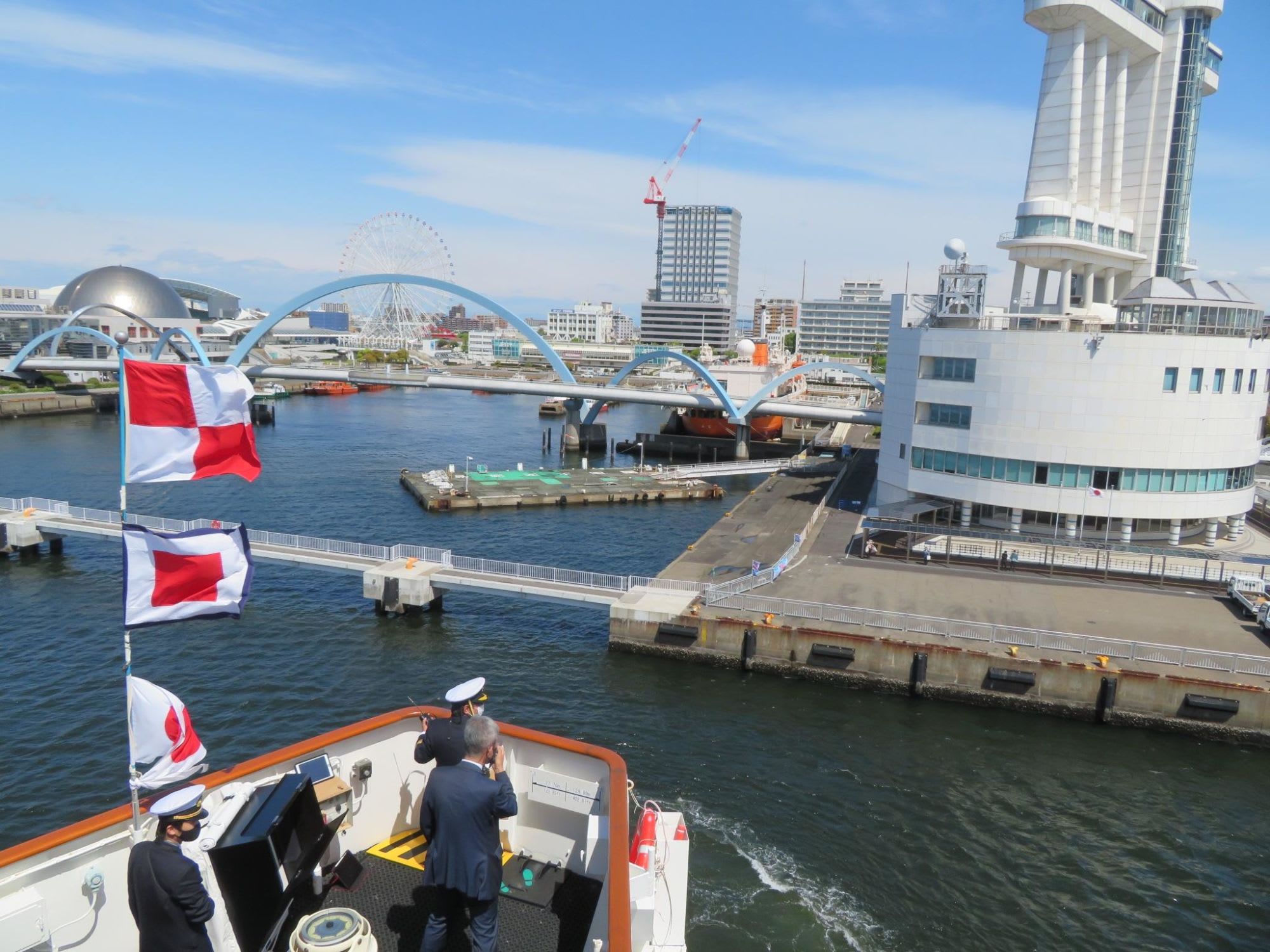いつもは岸壁側で入港シーンを見守っていますが、今回は船上から港の景色を眺めます。