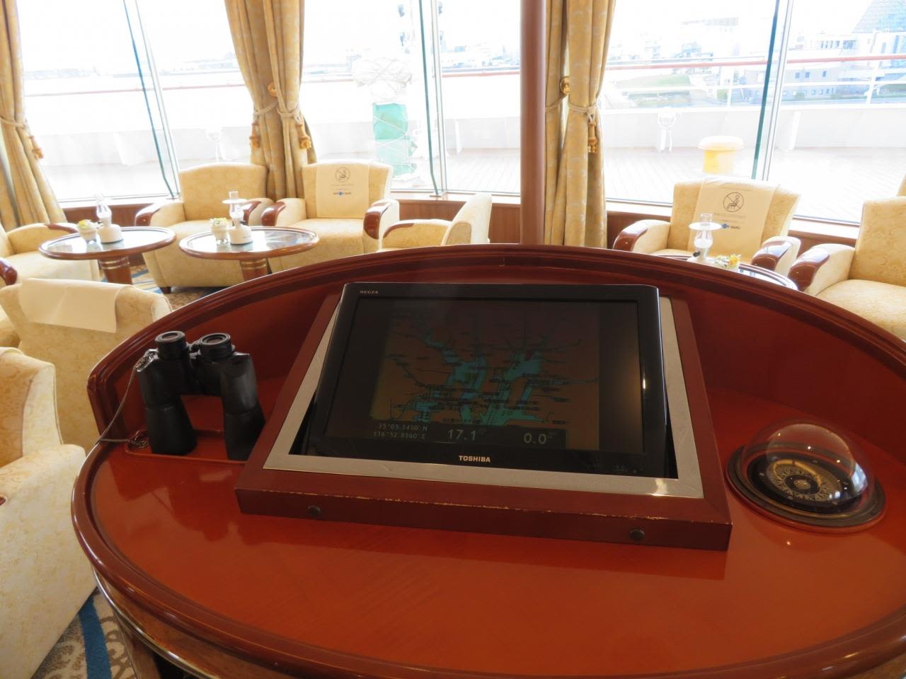 ホライズンラウンジには双眼鏡、方向計が配置され、船長気分で前方の景色を楽しめる席があり、私の指定席となりました!?
