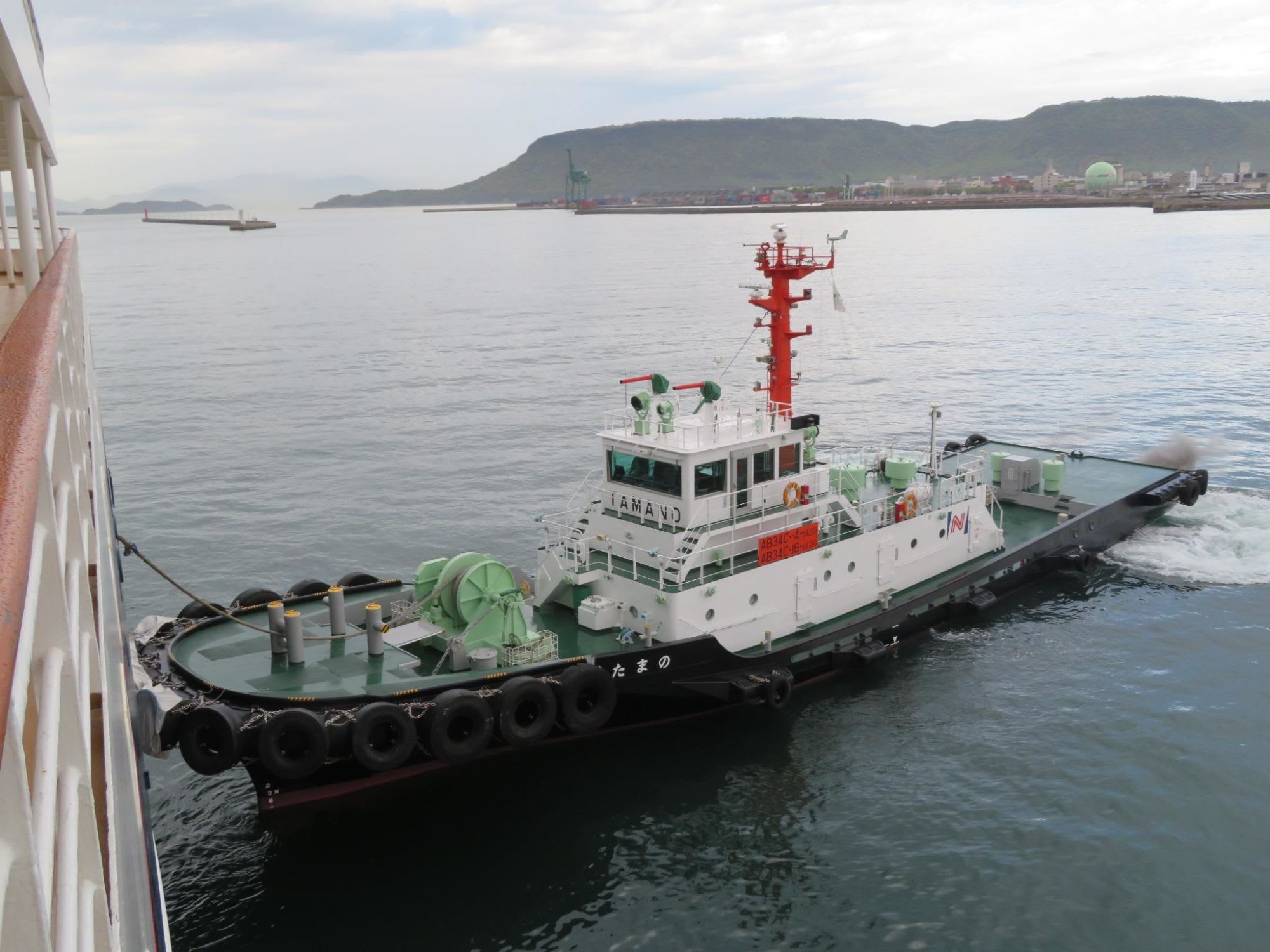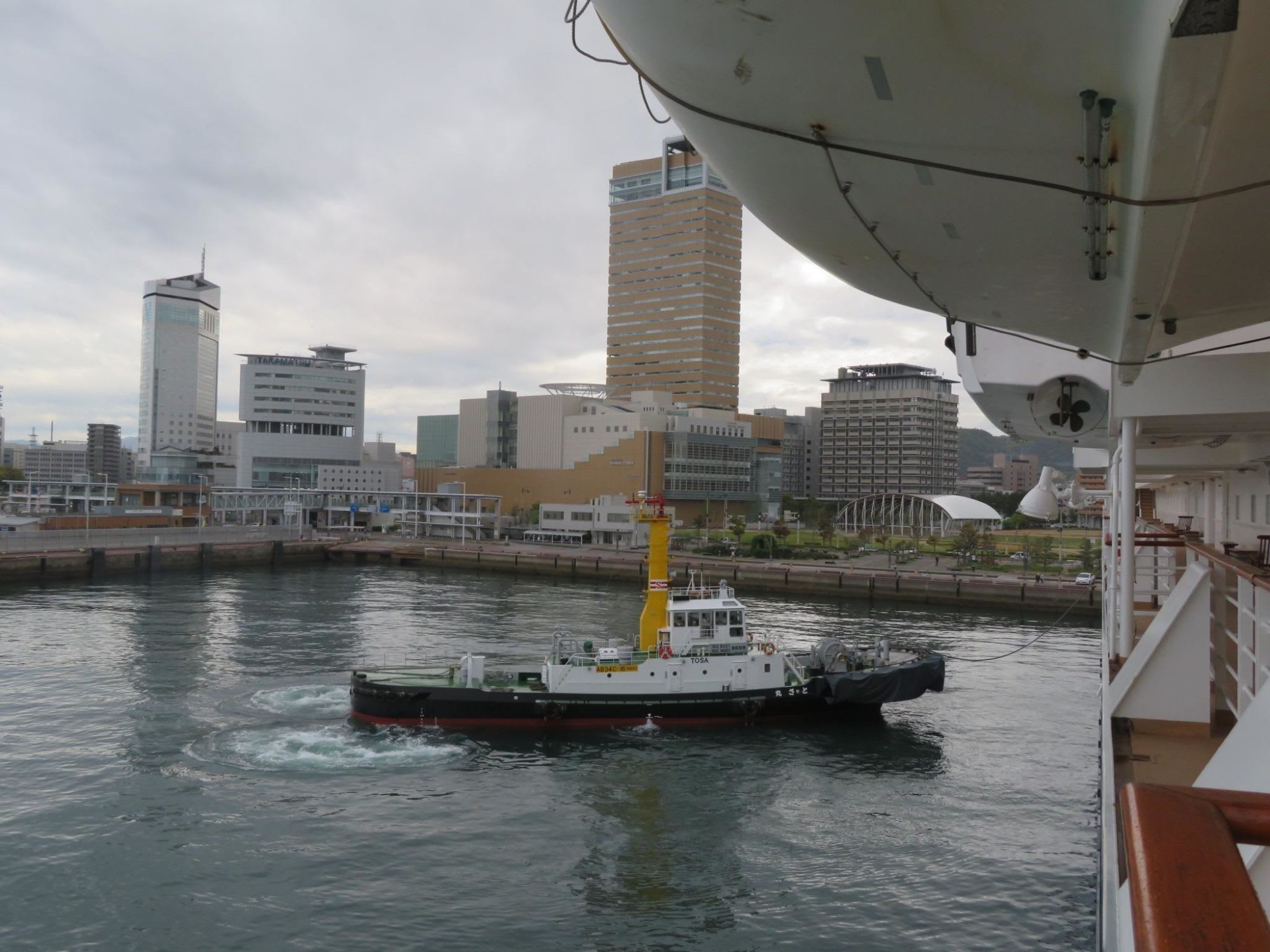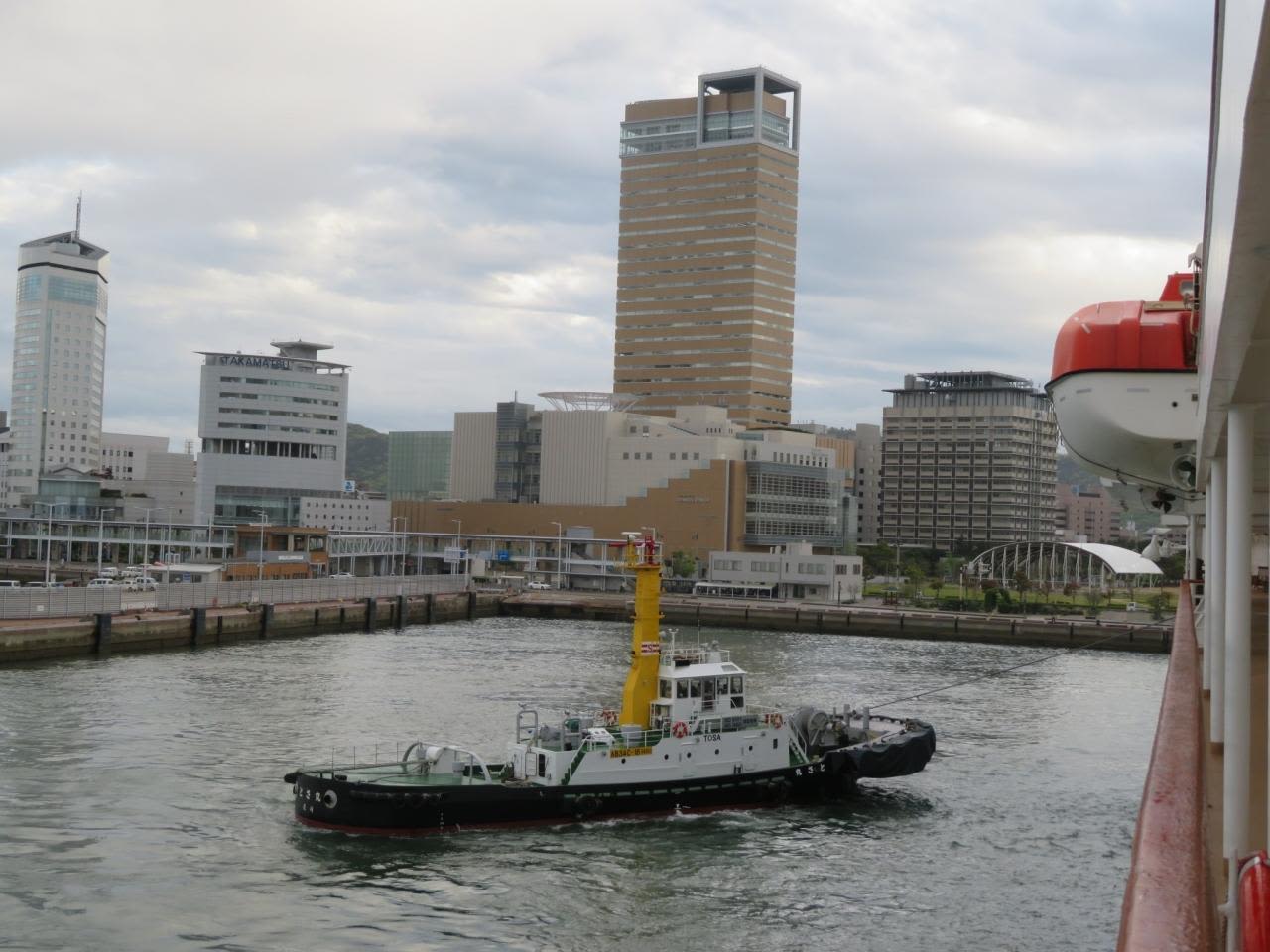 風も出てきたので出港時にはタグボート2隻が出動