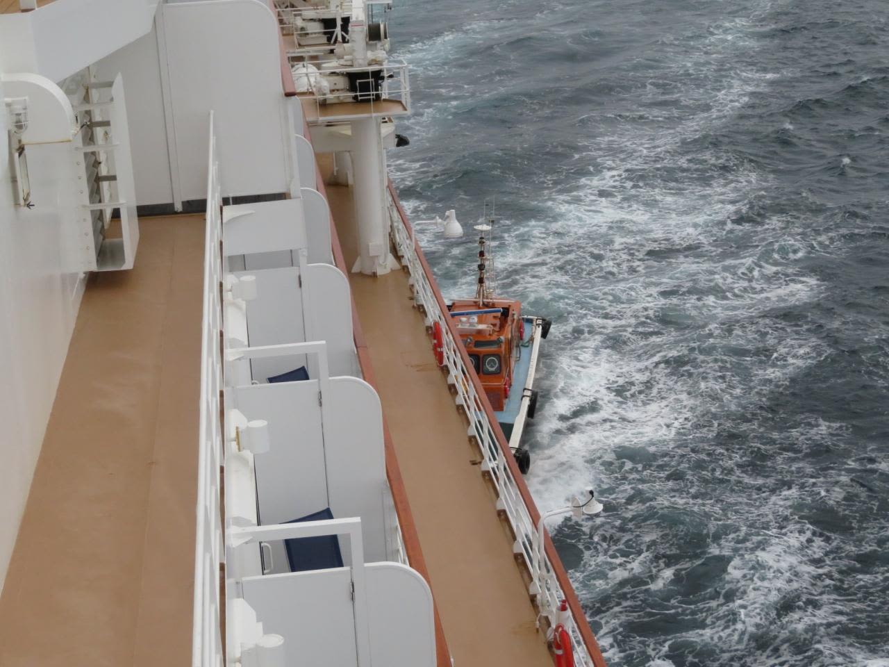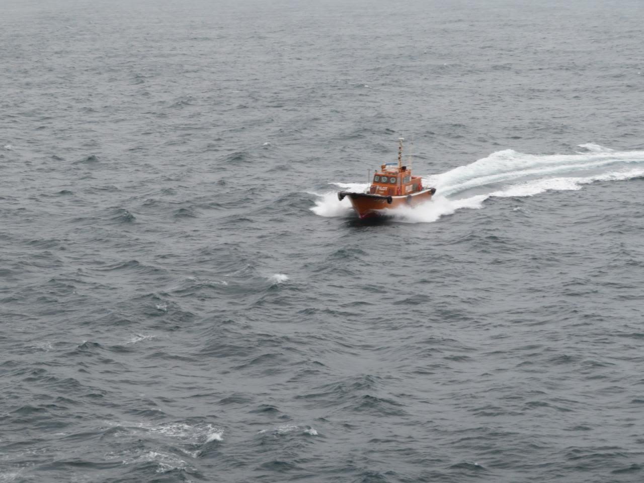 伊良湖岬が見えたので7時頃デッキに出たらパイロットの船が近づいてきました。