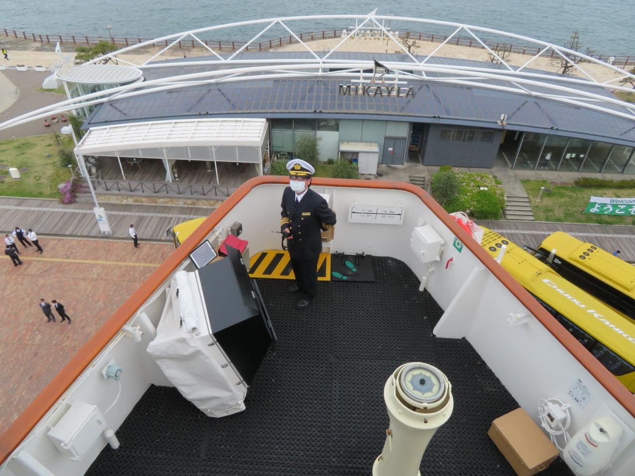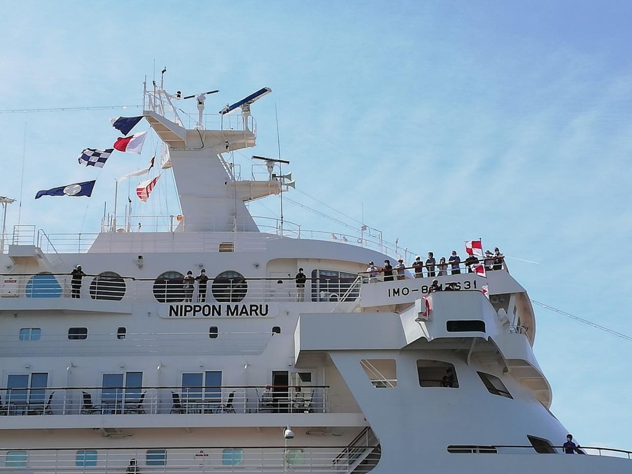 6階のブリッジ・デッキでもにっぽん丸関係者が見守っています。