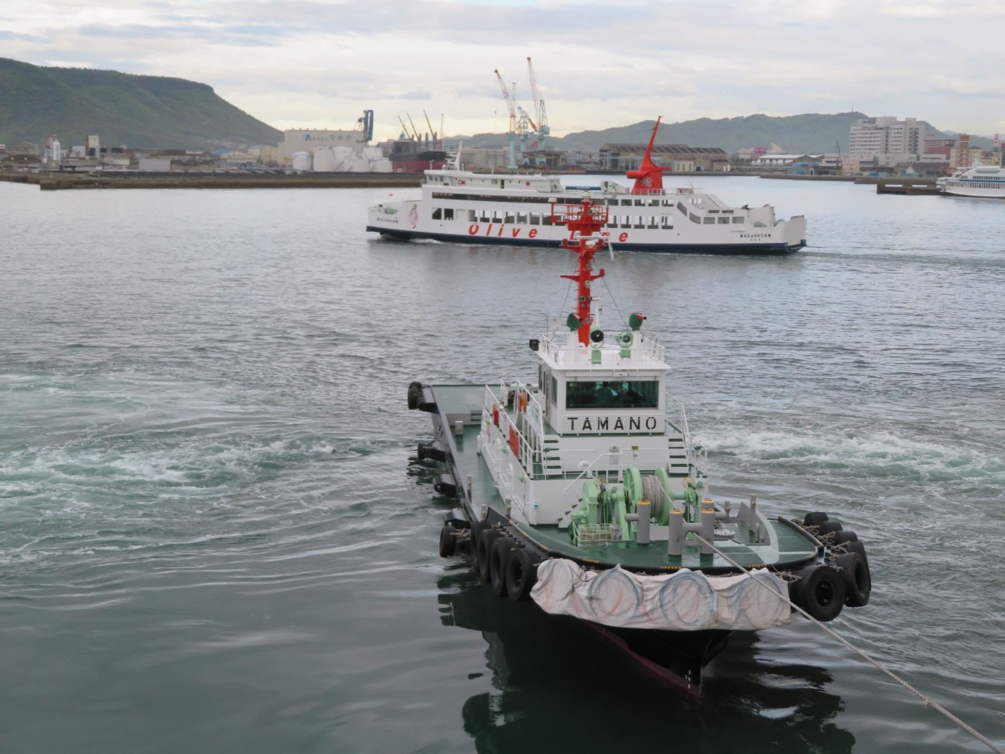 小豆島フェリーの第二しょうどしま丸(高松~小豆島間を運航)とタグボート・たまの
