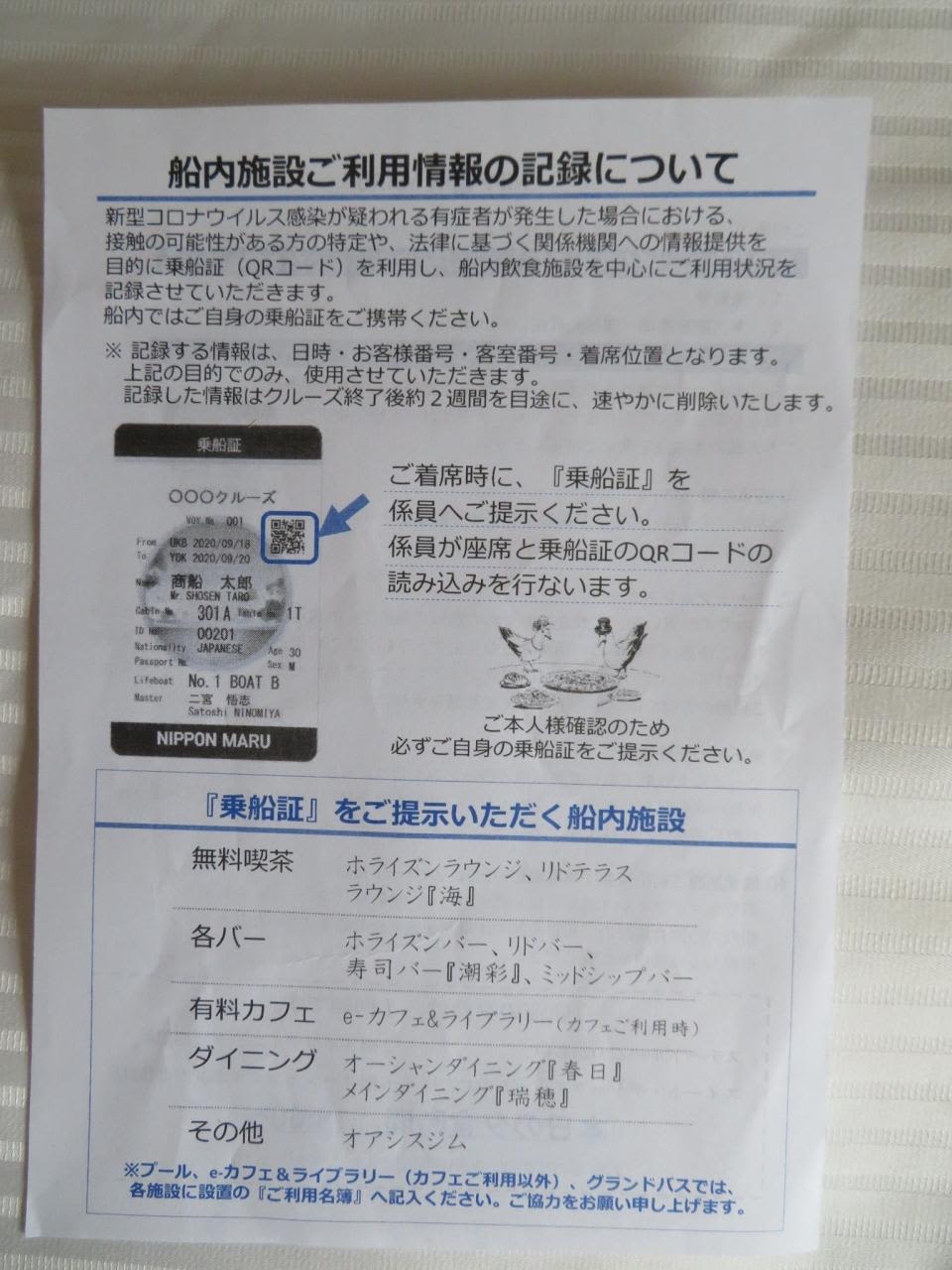 ダイニングや無料喫茶、バー、有料カフェ、ジムを利用する際は乗船証提示を求められ、記載されたQRコードを読み込み、万一有症者が発生した場合の追跡資料にされます。