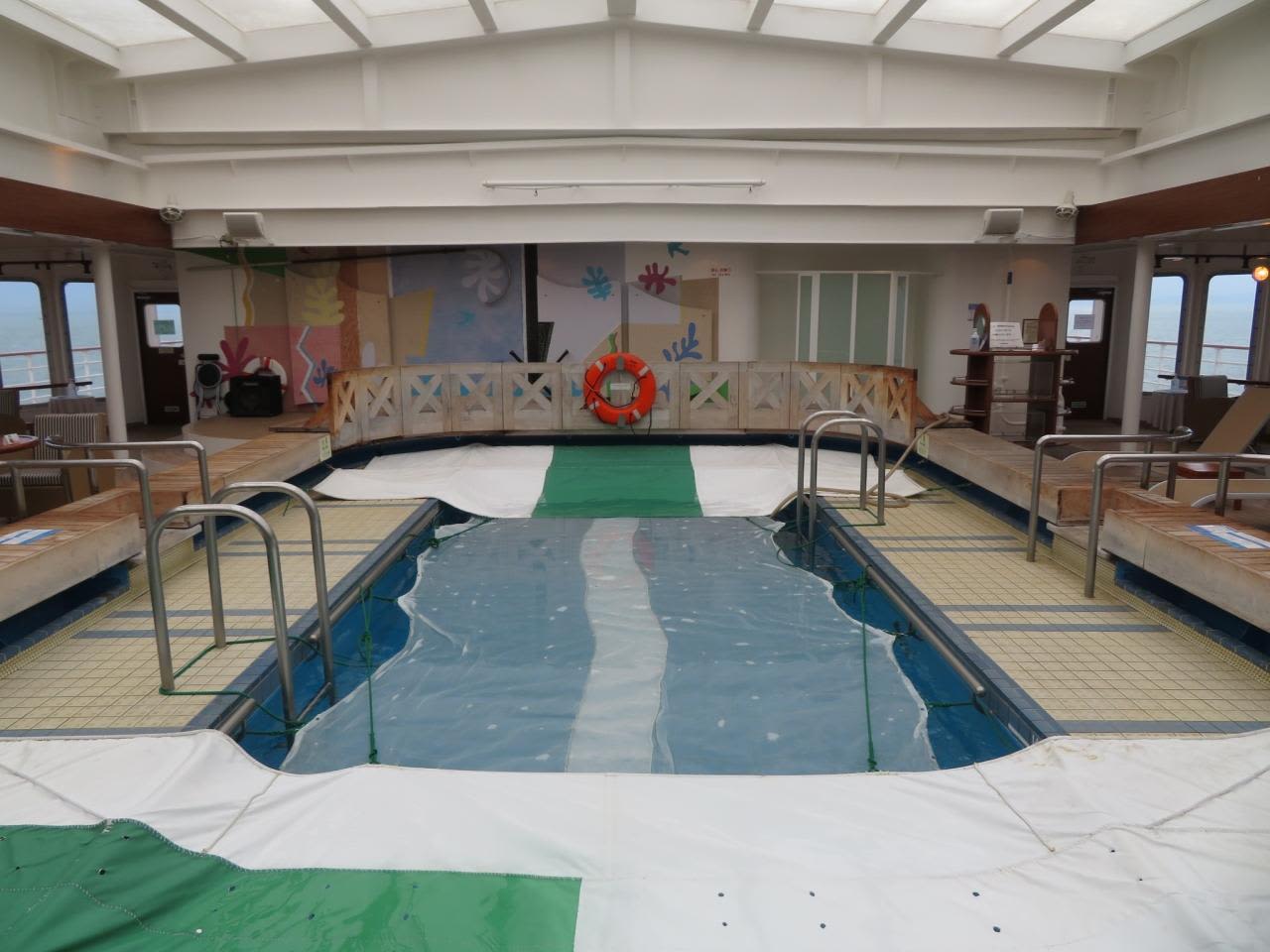 昨晩は荒天で揺れたのでプールにはシートが引かれていました。
