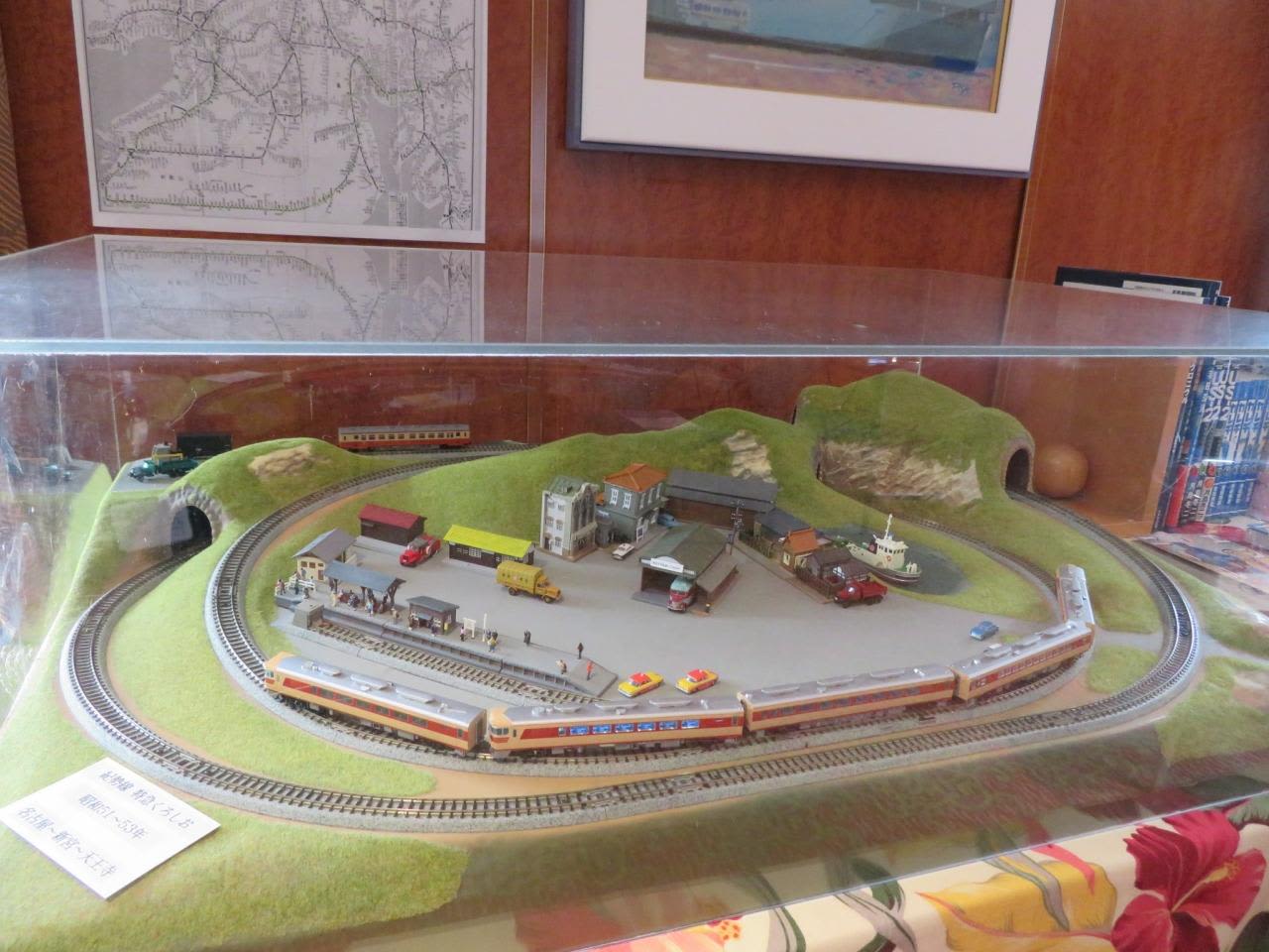 船上なのに紀勢本線特急くろしおの鉄道模型のジオラマも展示