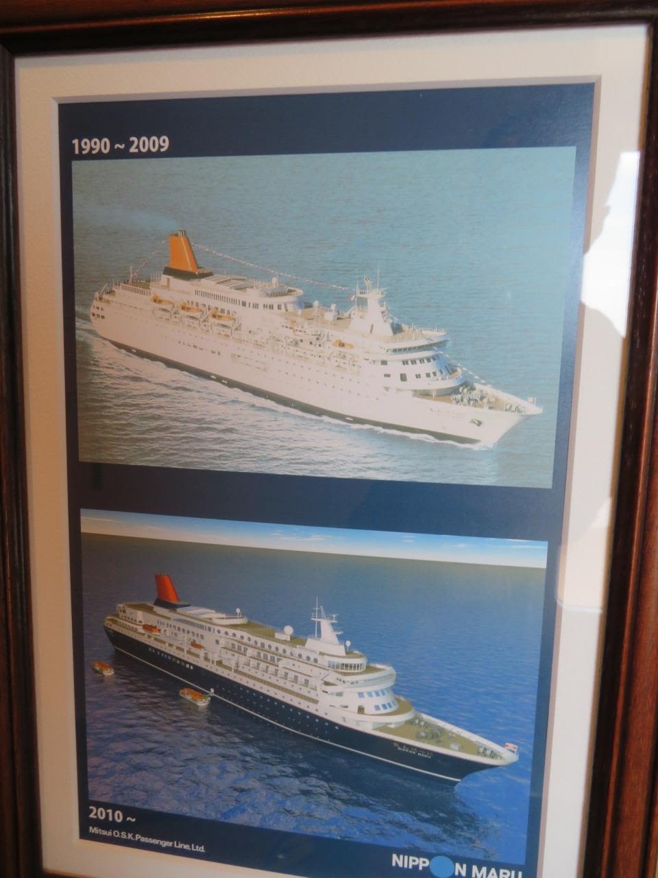 上段は左から3代目にっぽん丸(改装後)、にっぽん丸(改装前)